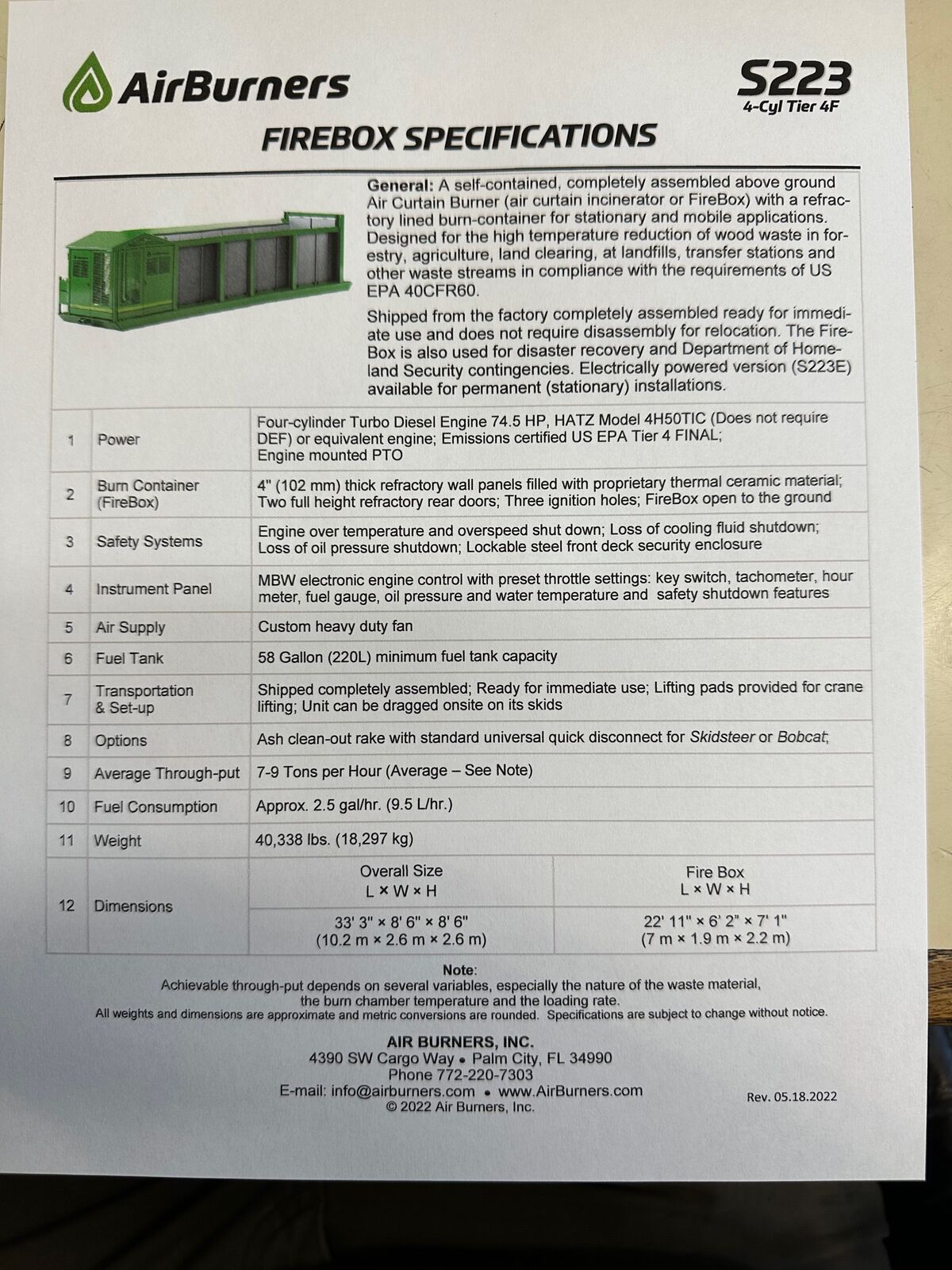 We are selling our Air Burner S223. This unit is like new with only 223 hours on it. There is a dent in the front door but it opens, closes and locks as it should.