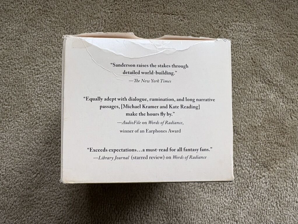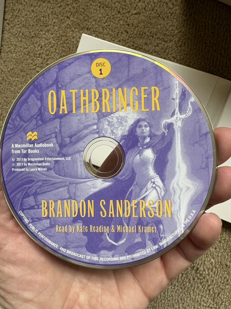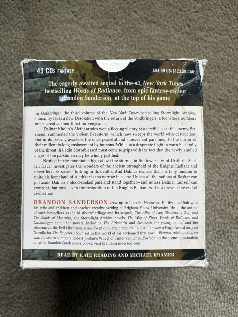 Oathbringer Audiobook, book 3 of The Stormlight Archive, by Brandon Sanderson. Unabridged on 43 CDs. 55.5 hours. Read by Kate Reading and Michael Kramer. Macmillan Audio, 2017. All discs in excellent condition. Outer box edges/corners have been repaired with tape (see photos). Text only. Cash or Venmo.