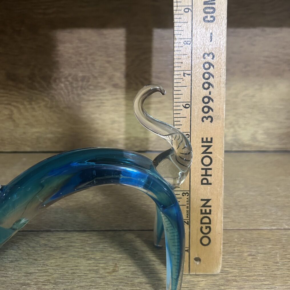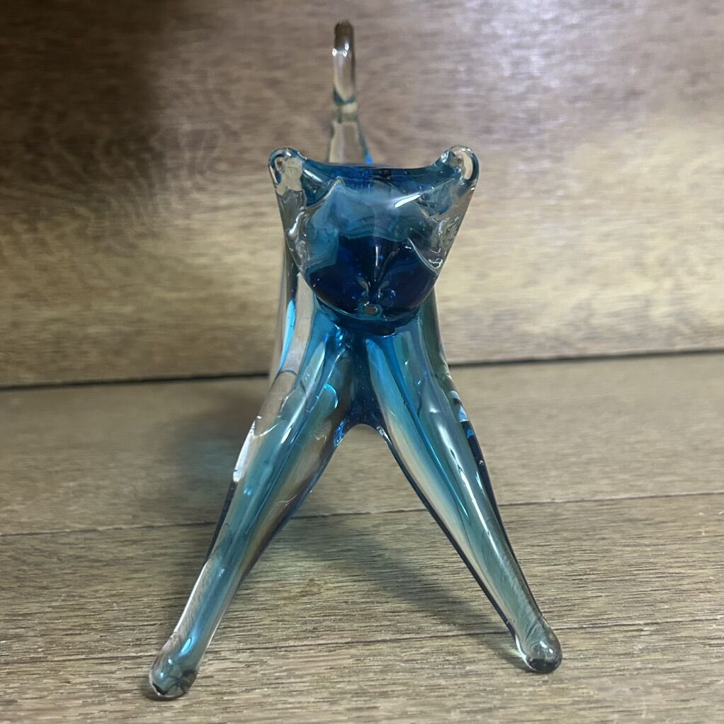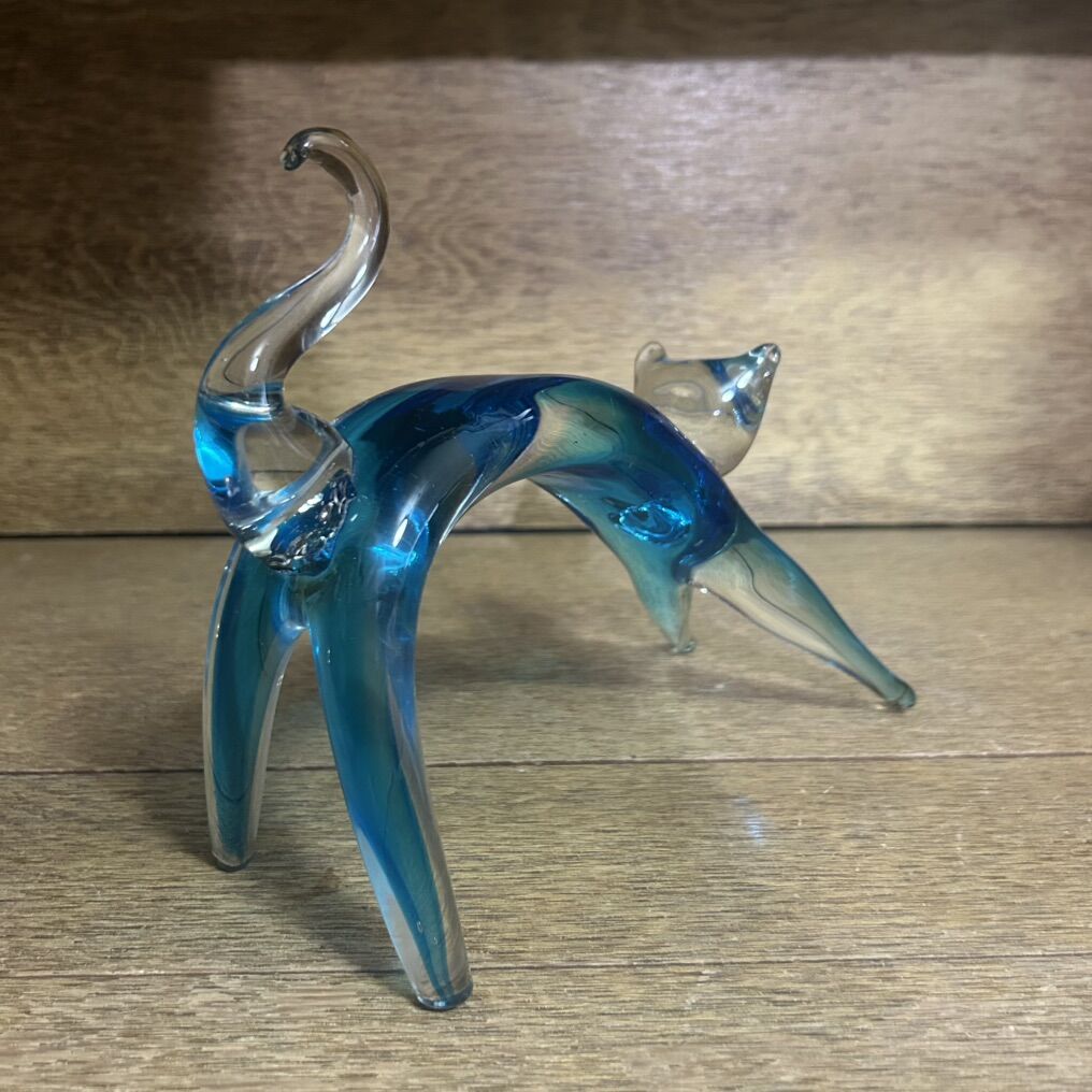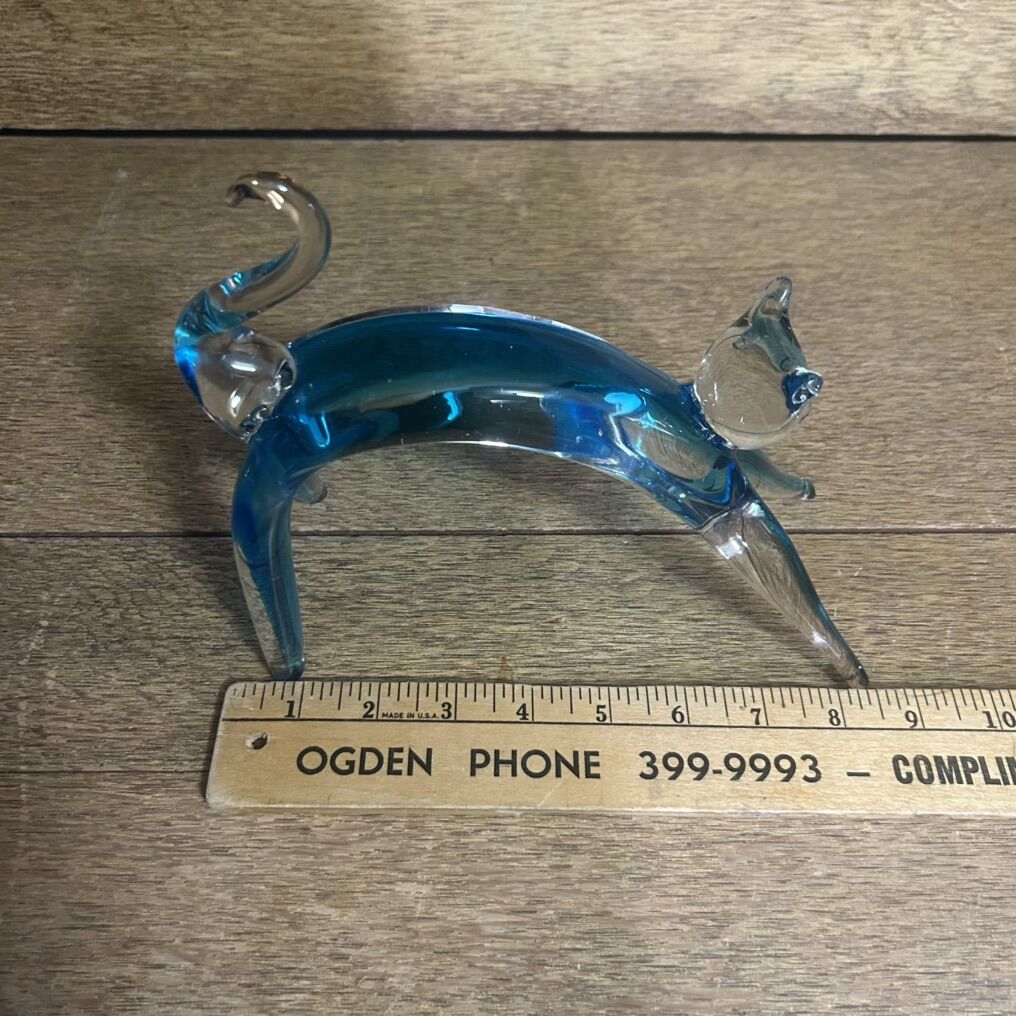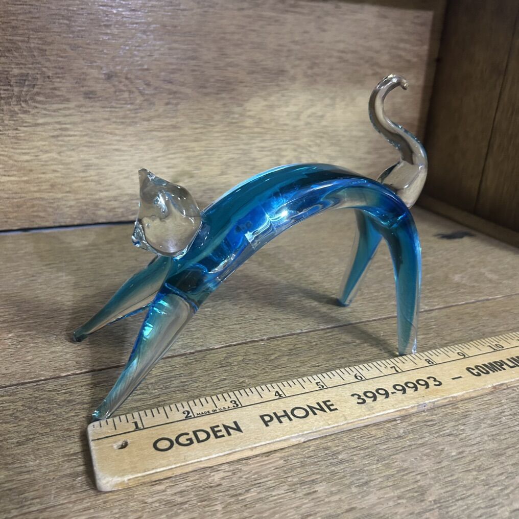 ApplePayLARGE stretching CAT Hand Blown Studio Art Glass Beautiful Bright Blue. This charming sculpture features a stretching cat design made of high-quality art glass. A stretching cat instead of a sitting cat is very unique and different. The bright blue glass is encased in a clear, glossy, smooth glass and gives the sculpture a fluidity like a real cat. The stretching cat sculpture is a vintage item and is made of hand-blown glass, making each piece one-of-a-kind. It is perfect for cat lovers and collectors.
