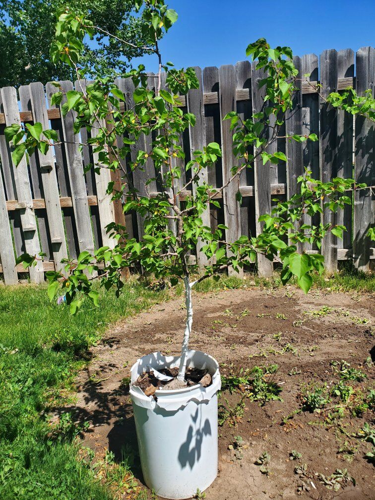 The 8 to 10 inch tall ones are 2 year old and $5. 4 peach left and a dozen apricot.