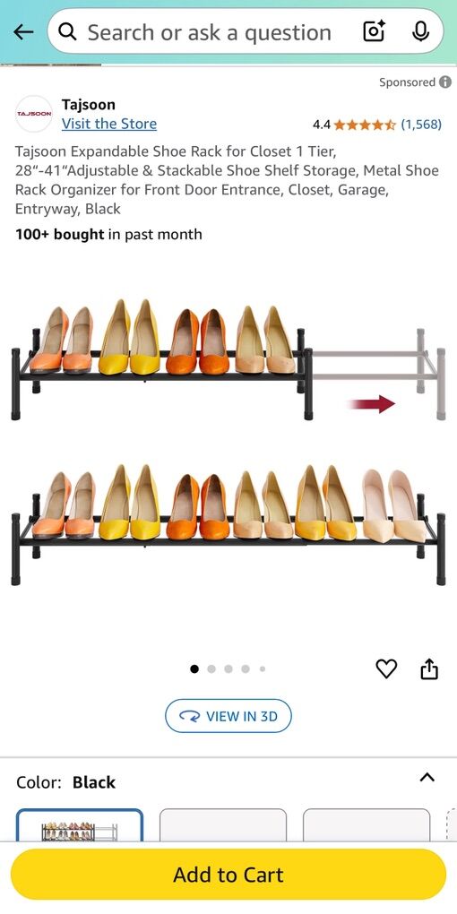 Description- Expandable shoe rack (adjusts from 28-41”) that holds 4-6 pairs of shoes. It is also stackable where you can add additional racks to create a multitiered shoe rack. See photos for more product information and specifications.