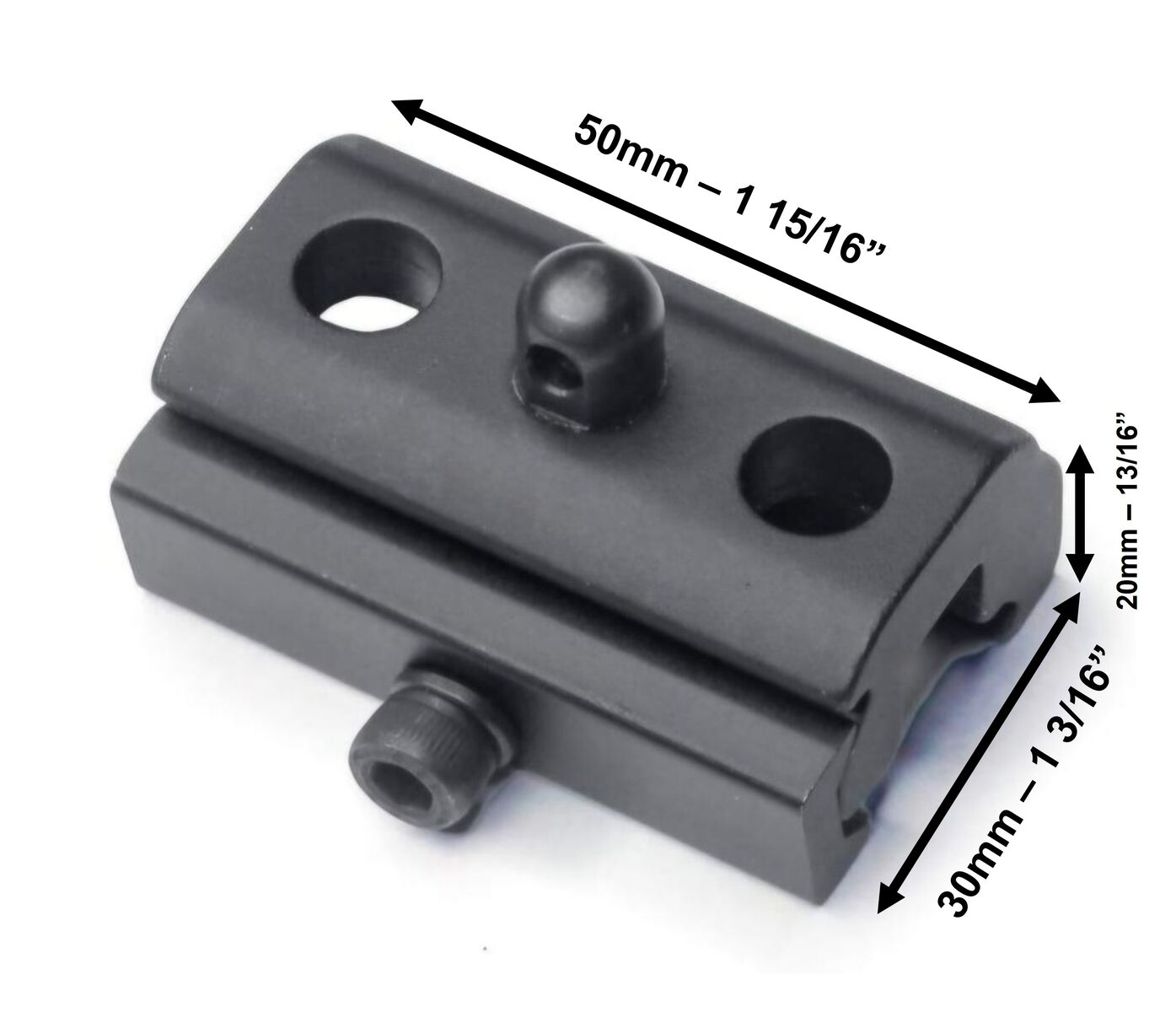 Product: Bipod Adapter with Sling or Lanyard Swivel Stud Purpose: Sling, lanyard or bipod adapter for Picatinny / Weaver Accessory Rail Bipod Mounting Type: Harris Style Rail / Clamp Size: 20mm (13/16”) Picatinny and Weaver Rail with 3 Holes MilSpec: MIL-STD-1913 (Pic Rail) Weaver Accessories: Weaver accessories will fit this type of mount. Overall Dimensions: See photos Retractable: Yes, stud retracts into housing when not attached to sling, lanyard, or bipod Material: Premium-grade 6061 aluminum Color: Black Finish: Anti-glare black anodized finish Installation: Quick installation with included hex / allen wrench Fitment: Works with virtually all Harris-type bipods Accessory Rail Fitment: Fits all picatinny and weaver style rails / mounts Leg Style Fitment: Bipod or similar means