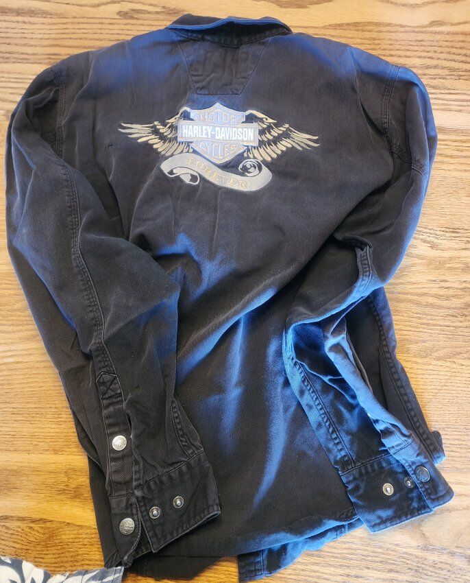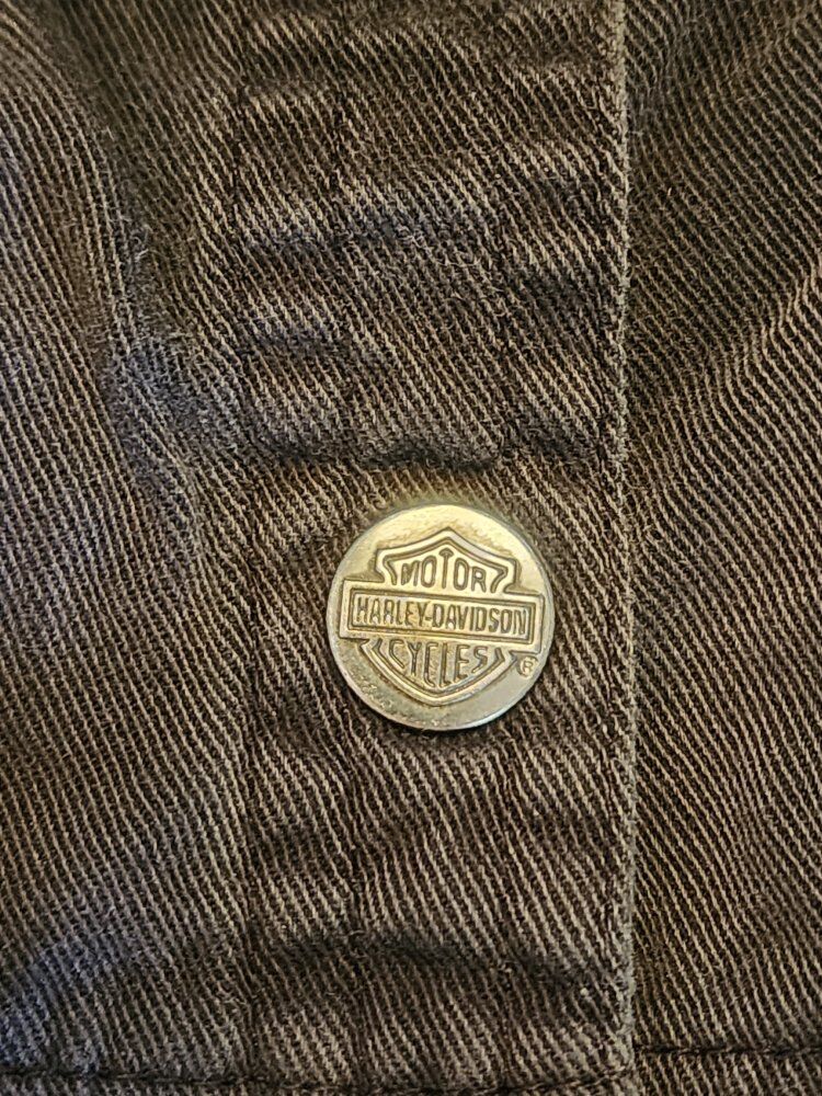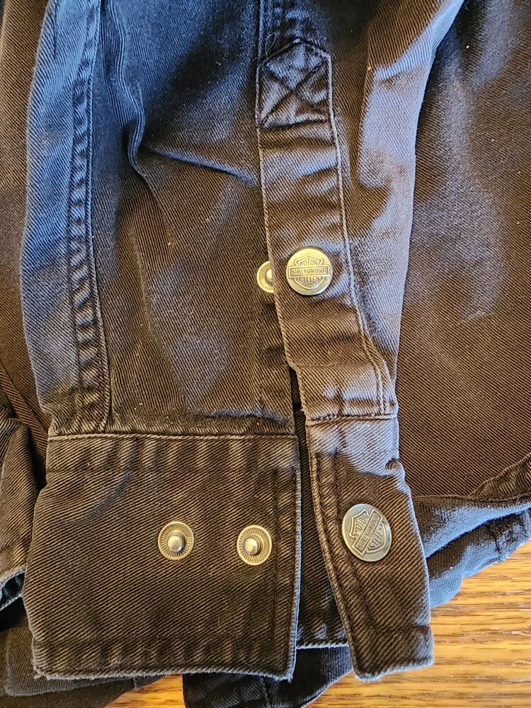 Channel your inner biker chick with this vintage black denim jacket from Harley-Davidson! This denim jacket features snap closures, long sleeves, and embroidered logo accents that add an edgy touch to any casual occasion. This jacket is perfect for any season and can be worn as a shirt or layered over other pieces.