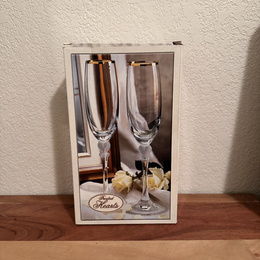 VenmoChampagne Flutes Set Like new condition Box has some writing on top but otherwise in great condition Set of 2 with gold trim