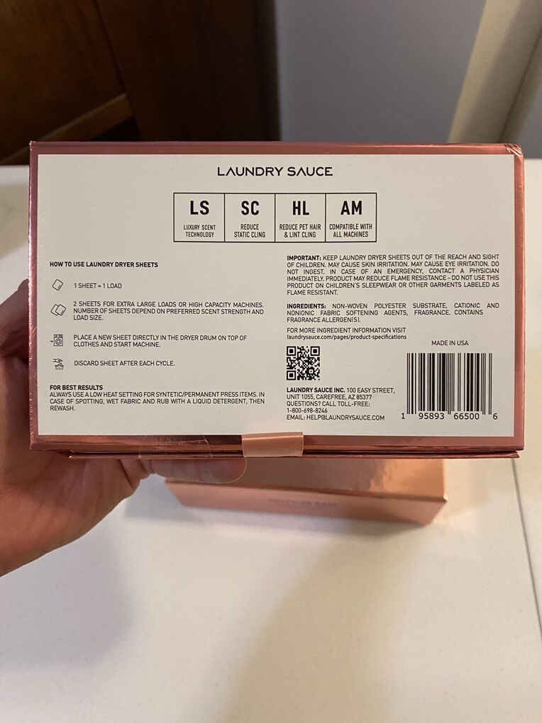 ApplePayThis is a new, sealed, bundle of Laundry Sauce laundry detergent and dryer sheets, 69 loads of each. These are high end cleaning products that sell online for $94. Here’s the online description of this bundle: “Immerse yourself in the epitome of laundry sophistication with the Laundry Sauce Most Popular Package. Our Performance Laundry Pods are up to 4 concentrated compared to traditional liquid laundry detergent, tackling stains while imparting a luxurious fragrance. Anti-static Luxury Dryer Sheets deliver an extra layer of scent, elevating fabric softness. A symphony of science, luxury, and powerful cleaning in one package.” The description of the scent: “Step into seduction as a captivating blend of Egyptian geranium, powdery violet, and warm nutmeg beckon you closer. Rich, red damask rose, honeyed hawthorne, spicy cinnamon, and fiery clove draw you into a warm embrace, and an alluring bed of sweet vanilla bourbon, comforting cedarwood, leathery vetiver, and velvety musk create a powerful impression that’s impossible to forget.”