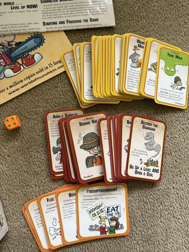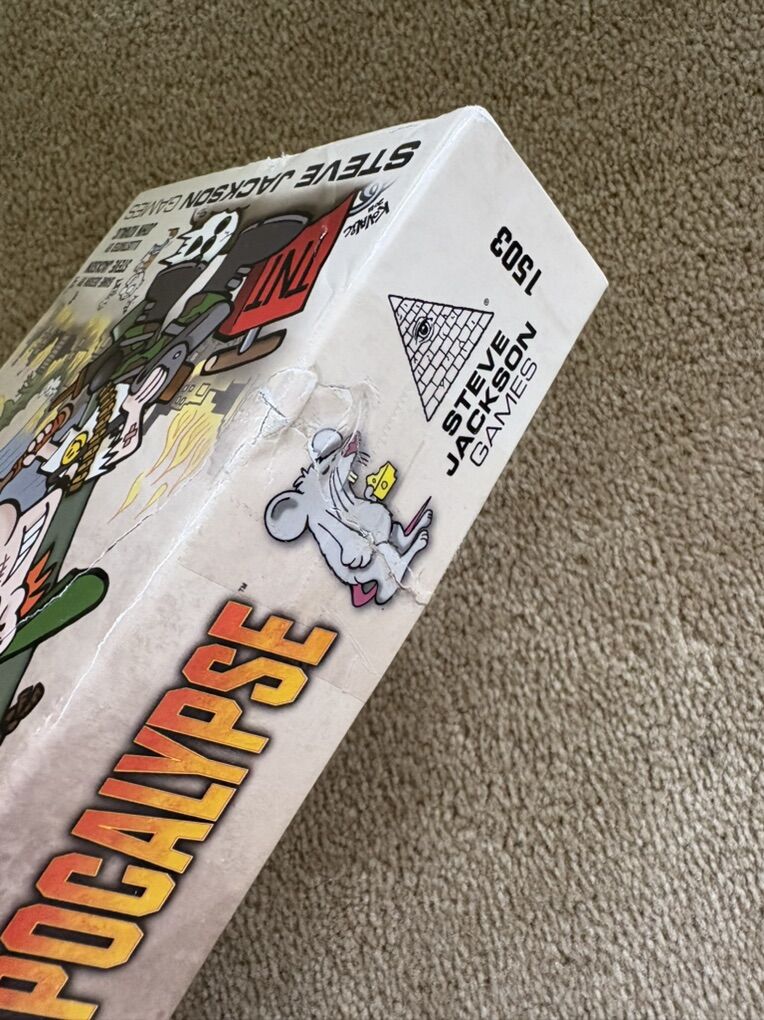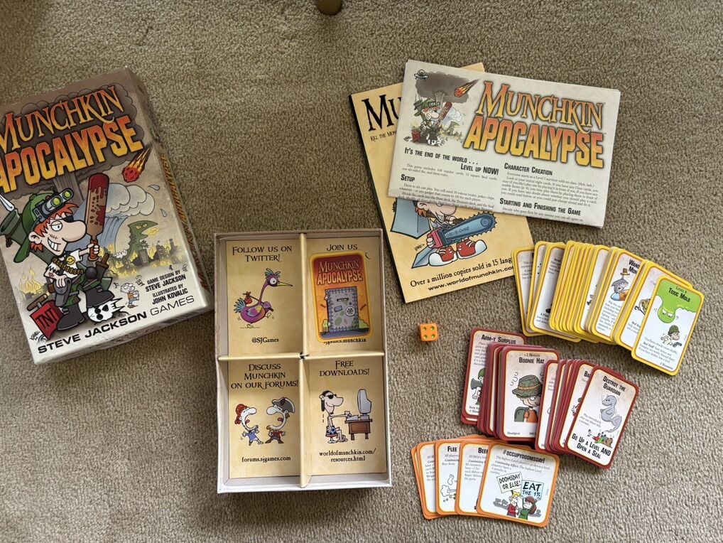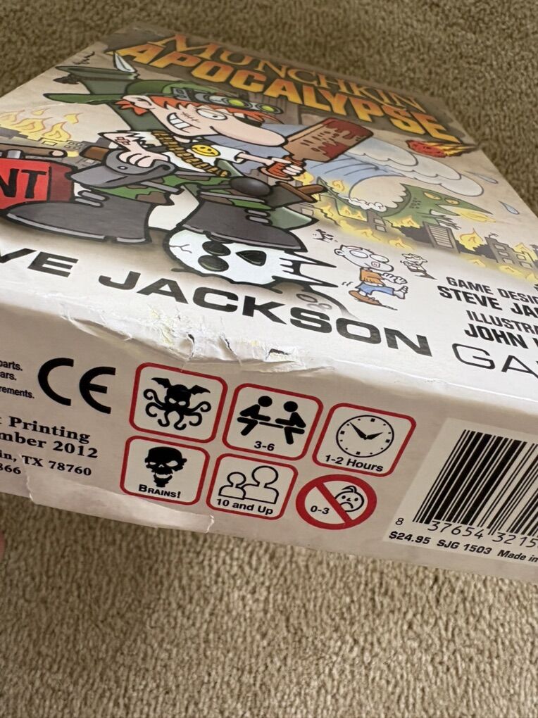COMPLETE Munchkin: Apocalypse Game. It’s the end of the world … level up now! Steve Jackson Games, 2012, 1st edition. 3-6 players, ages 10+. Complete, no missing pieces. Components in excellent condition. Box damaged—repaired with tape. Text only. Cash or Venmo.