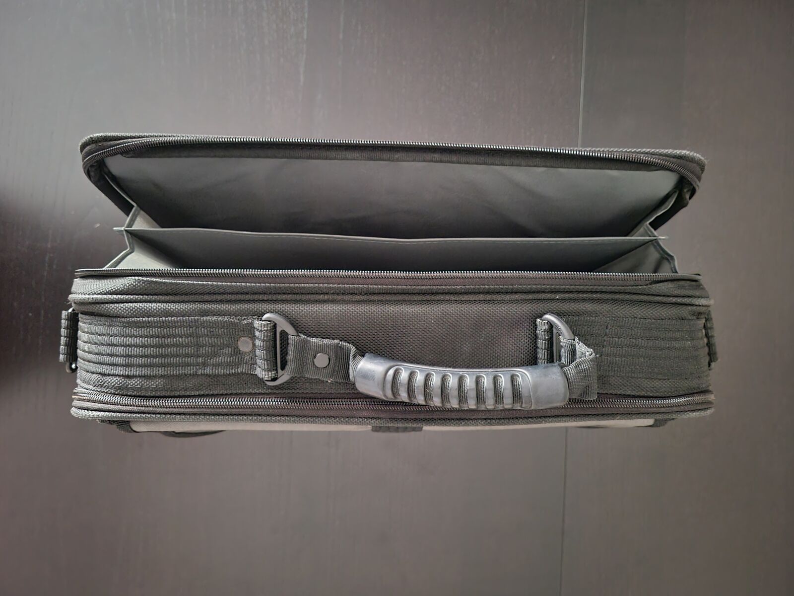VenmoSold for 69.99 when new. In very good condition except for the painted metal parts where some of the paint is missing due to use. Measures 18”w x 5.25”d x 15”h and has a detachable shoulder strap. Nylon construction with heavy-duty steel fittings. Padded computer compartment. Full-length exterior document pocket & expanding file compartment. Easy access front section.