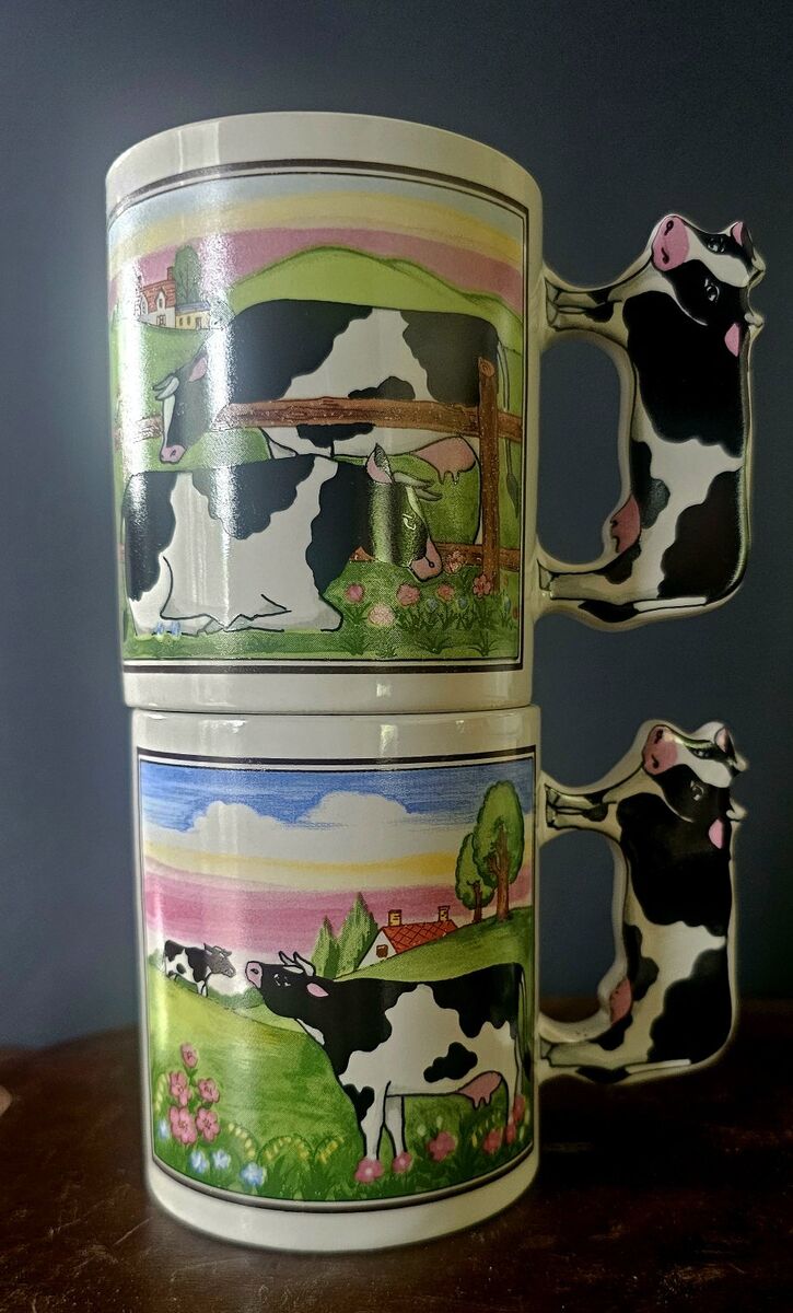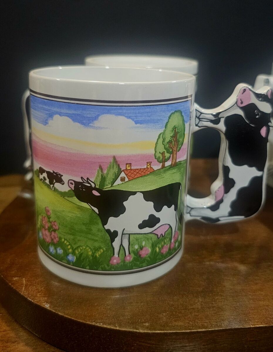 Very colorful Holstein black and white country farm cow mugs. Green rolling pastures, farmhouse, little flowers and a church as a back drop. These are NOS (new old stock) set of 4, marked JAPAN on the bottom of each, BUT never used & so they look shiny & new!! I took them out of their original packaging & removed the retailer stickers. Great collection set for those who love the country, farms and cows.