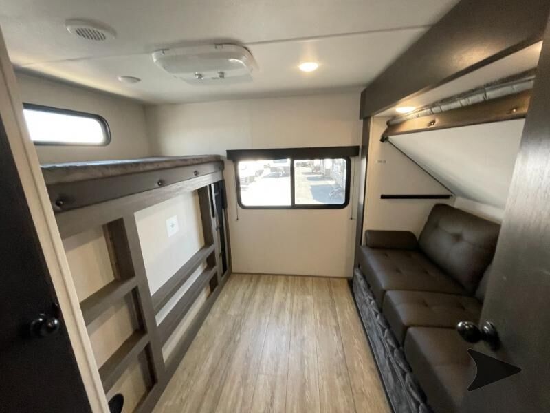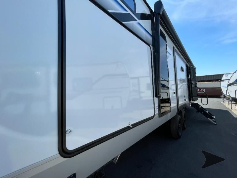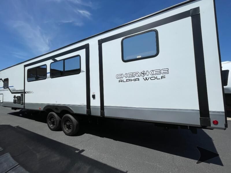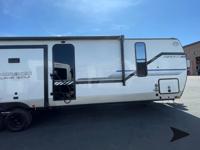Forest River Cherokee Alpha Wolf travel trailer 33BH highlights: Bath and a Half Rear Bunkhouse Kitchen Island Dual Entry Juice Pack with 100W Solar Panel Outdoor Kitchen Load up your clothes, food, and outdoor gear to enjoy a long weekend away from the city in this travel trailer! There aretriple slide outs, a private bunkhouse with a half bathroom with asecond exterior entry/door for convenience, plus an outside kitchen, complete with ice! The bunkhouse also has two bunks, a jackknife sofa and a trundle bed, plus a slide out for more interior floor space. The main living and kitchen area is spacious as well with two opposing slides, a kitchen island with a largesink, a pantry, plus a cozy fireplace.The full walk-through bathroom allows double access, and the front bedroom allows you to sleep like royalty. With any Cherokee Alpha Wolf travel trailer by Forest River you'll enjoy outstanding amenities, quality construction, and an affordable price. Each model features a "ToughBend" rigid skirt metal design, 5/8" tongue and groove plywood floor decking, and a "SuperTruss" roof structure that will hold up through years of camping memories. There is a pet friendly "clean sweep" floor design with no heat vents indoors, along with a super lumen lighting system, a 15,000 BTU quick cool central air conditioning, and many more comforts. There are many convenient exterior features such as, Leash Latch pet safety technology, an outside shower with hot and cold water, On The Go rear ladder prep, and exterior steps with oversized landing and quick release. The Weather Guard Package will add protection against the elements with an armored underbelly tank enclosure and forced air heat, thermo-control reflective safety glass windows, and upgraded laminated walls with block foam insulation!
