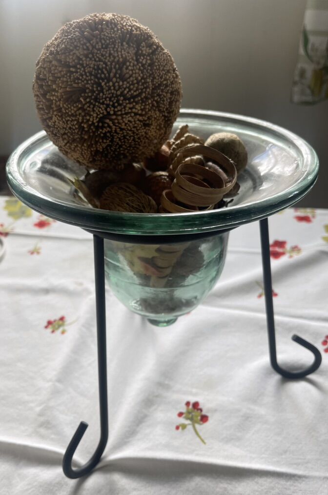 Unique vase with stand. Filled with dried leaves, nuts etc. purchased at pier one. Asking $13 will consider reasonable offers price drop to $10 Price dropped to $8 drop $6