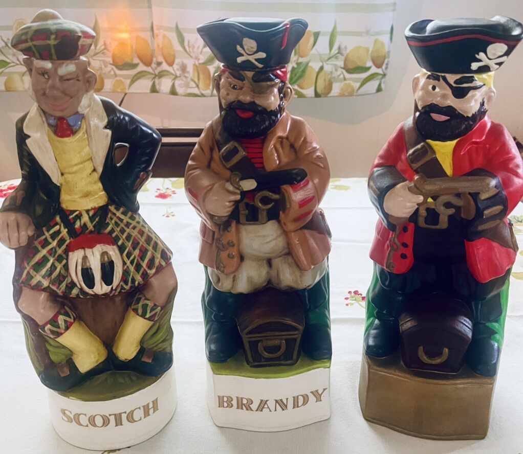 I have three decanters. Two pirates and one Scottish. They are empty and they are hand painted. Asking $15 each. Will consider reasonable offers Price drop to &10 each. Price dropped to $8 each Drop $6 each price drop $5.00 each