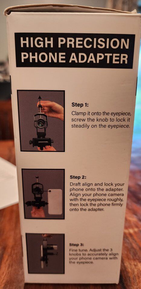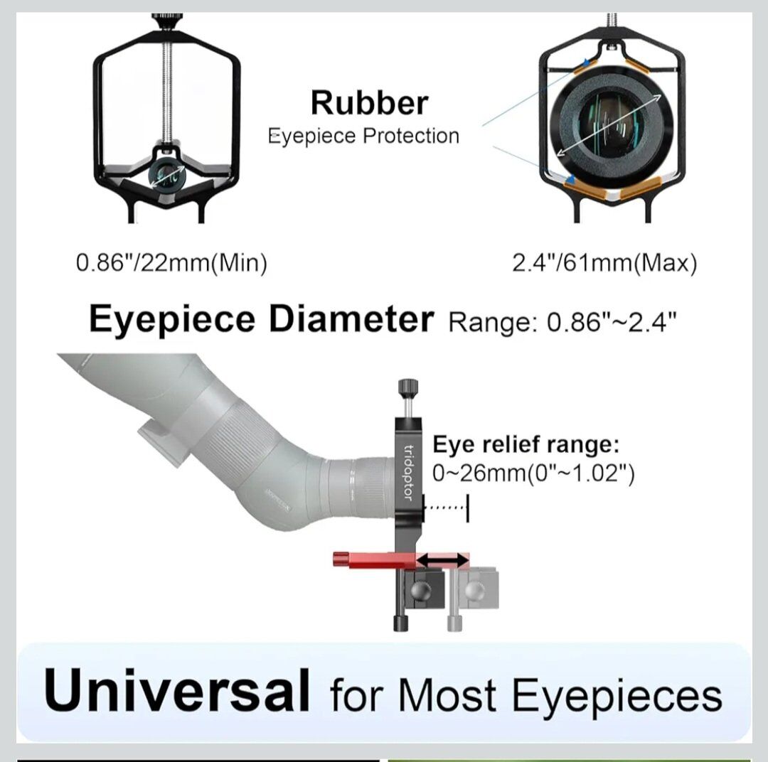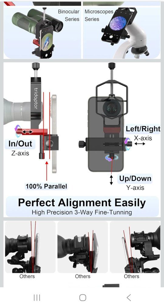 REVOLUTIONARY PRECISE 3-AXIS DESIGN (Patent Pending): (Upgraded from ACCUVIEW) The telescope phone mount features 3-direction precise adjustment, up/down, left/right, forward/backward, to align your cell phone camera with eyepieces precisely. Z axis adjustment helps reach the correct eye relief to capture the clearest images and videos of celestral objects, wildlife and other distant objects with your smartphone like never before ALL METAL BUILD, NO SAGGING: Made of rigid aluminum alloy, the universal phone adapter for digiscoping is robust and durable, doesn't bend, tilt or warp, holds your cellphone tight and perpendicular to the telescope eyepiece, maximizes stability and minimizes shaking throughout setup, with rubber pads on both the eyepiece clip and cellphone clamp protecting devices against abrasion HIGH PRECISION FINE-TUNING: The smart phone adapter for telescope is engineered and machined for high precision adjustment and razor-sharp alignment with the lens. Easy-to-reach XYZ fine-tuning knobs realize stable and accurate adjustment. Firm grippers hold both the phone and eyepiece securely in place ONE FITS MOST: The spotting scope phone adapter fits iPhone/Android smartphones of almost any brand/model (width 2.36"-3.44"/60mm-87.5mm), regardless of phone camera design or weight. The smartphone digiscoping adapter can hold eyepieces (outer diameter 0.86"-2.4"/22mm-61mm) of most telescopes, spotting scopes, monoculars, binoculars and microscopes. With our durable and versatile phone scope adapter, you won't have to spend more on new adapters every time you upgrade smartphones or scopes HANDS-FREE SHUTTER REMOTE CONTROL: The mobile phone telescope adapter kit includes a Bluetooth shutter release for shooting without touching the phone screen and thus prevents shaky photos. The 3-axis digiscoping adapter kit is sleek, compact and lightweight for any digiscoping adventure, making it a must-have gadget for astronomers, nature photographers, birdwatchers, travellers, researchers and more.