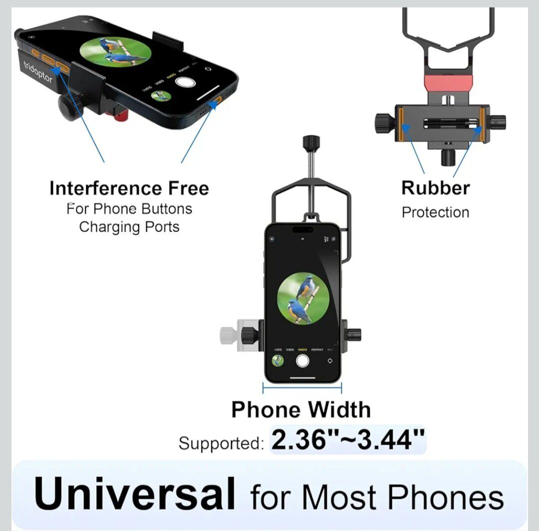 Tridaptor - Universal Phone Scope Digiscoping Adapter|High-Precision XYZ Metal Telescope Mount 3-Axis Smartphone Holder for Spotting Scope Monocular Binos|Fits All Cell Phone Camera/Max 2.4" Eyepiece