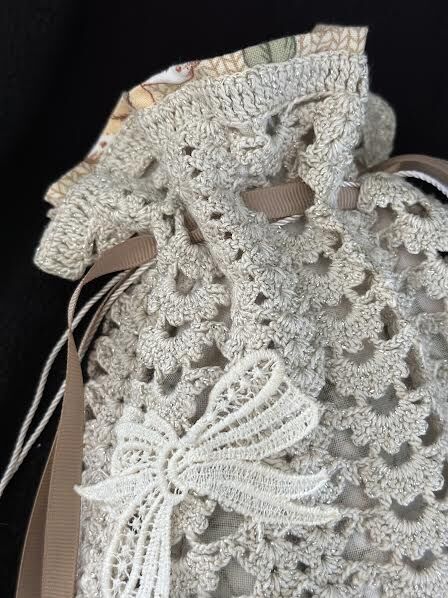 VenmoCrochet handmade bag. Cream cotton metallic thread. Cotton print lining. Measures12” x 8.5”. Weight 4.5 oz. Opening 6”. Ribbon/string drawstring closure. Lovely assortment of crochet stitches. Beautifully finished. Excellent like new condition.