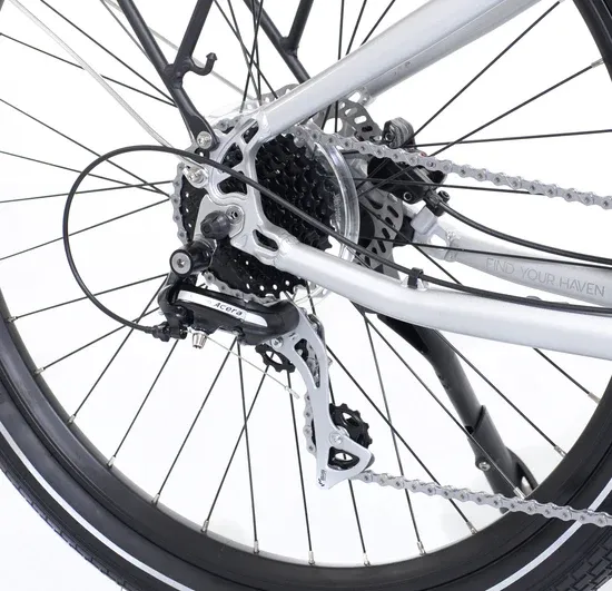 A top-of-the-line e-comfort bike. The Power Wave features a lightweight aluminum frame and fork, rear luggage rack, front and rear fenders and a versatile 8 speed drivetrain. The hydraulic disc brakes provide excellent stopping power. It’s 250 Watt, 36V Mid-Drive Bafang motor will provide an extra power boost with higher effort pedaling, thanks to its intelligent drive unit. If you’re the type of a person who wants the best, then this is the bike of your dreams.