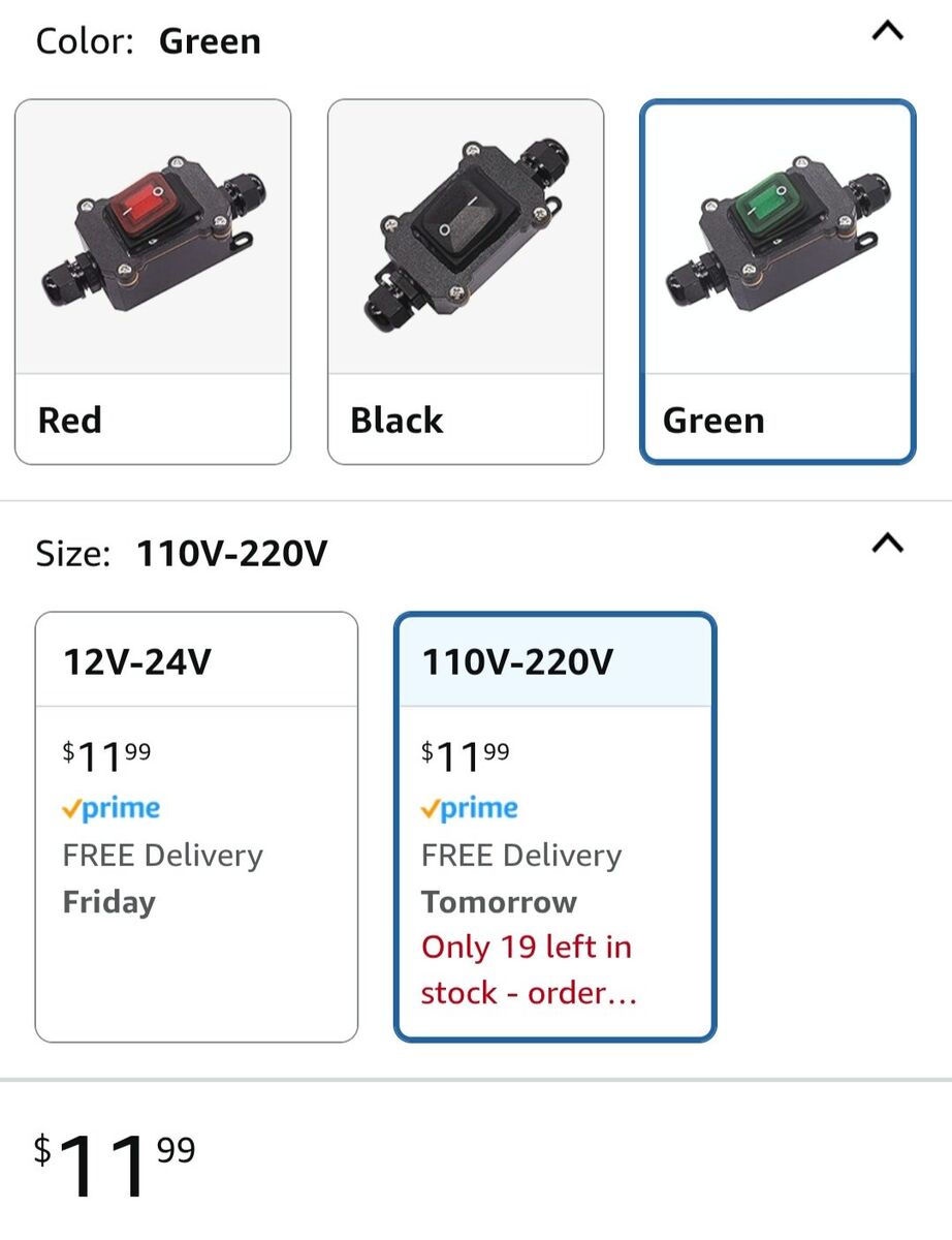 PayPalNew, green weideer IP67 outdoor Waterproof inline cord toggle switch, 20A, 115V to 250V ($12.99 on Amazon).