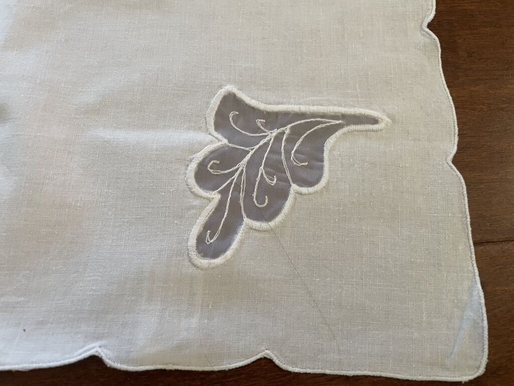 I have 2 new white napkins with a leaf design in one corner. They have a beautiful edge. They are about 16 1/2 inches by 17 inches. They are cotton and polyester. I have a 3rd one that matches but isn’t new. It has been washed so it’s wrinkled. You can have it as well (for free) if you would like it. See my other ads for jewelry, artwork, home decor and more.