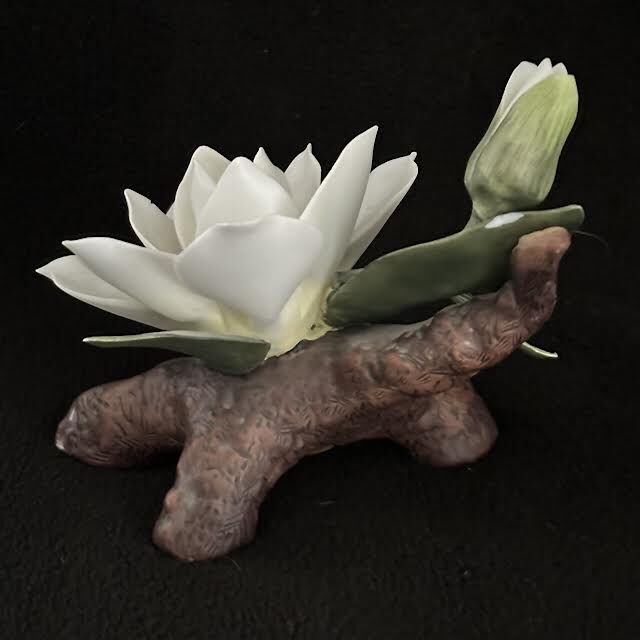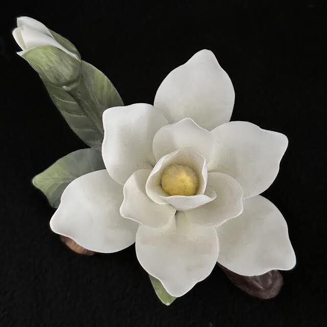 VenmoANDREA SAKAK white magnolia and bud on branch figurine. Large white bisque porcelain flower with yellow center. White bud and green leaves rest on brown branch. Measures 5” W x 5” H. Weight 9 oz. Excellent like new condition. No chips or discoloration.