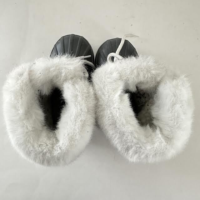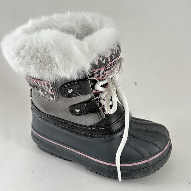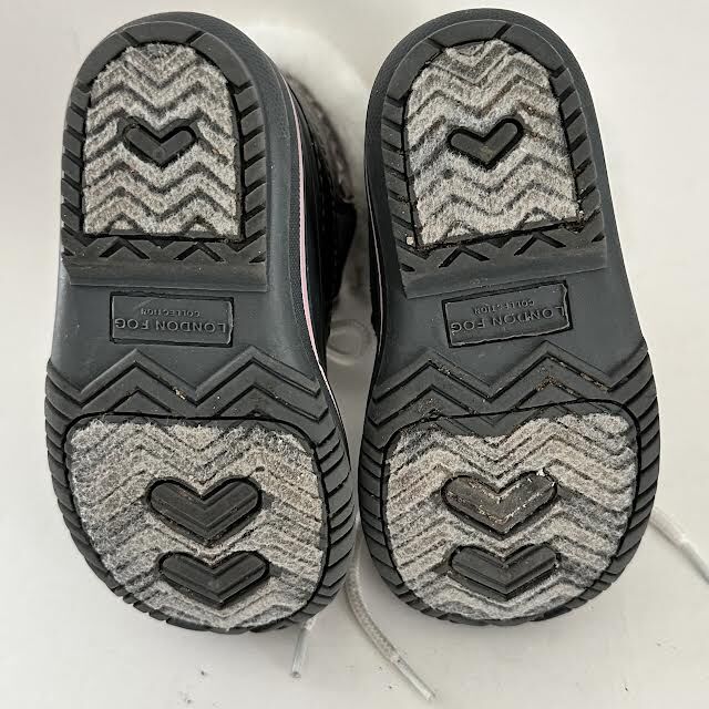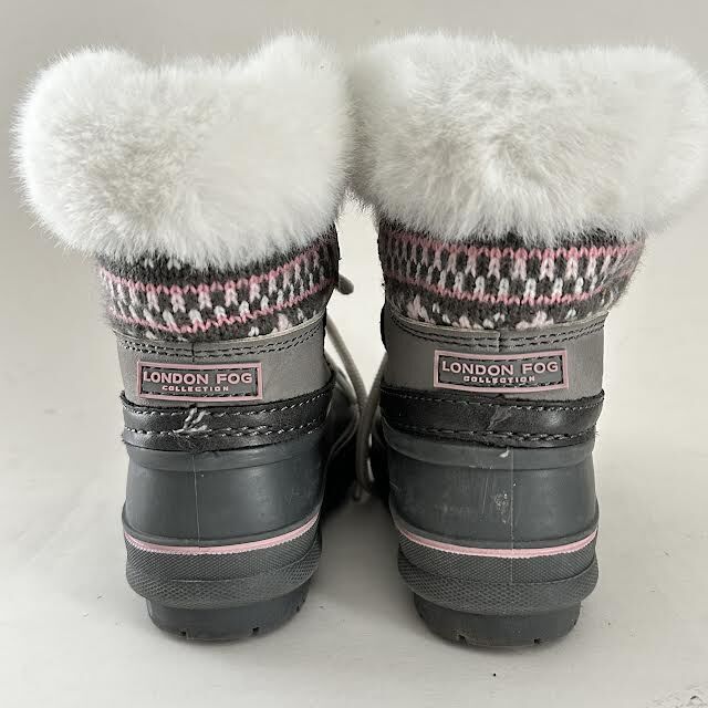 VenmoLONDON FOG Collection girls cold weather boots. Size 7. Grey. Pink, white, grey knit pattern on tongue and shoe back. Two hole lace up. Long white laces. Rubber tread. Faux fur cuff. Weight 12.5 oz. Excellent condition. No sign of wear.