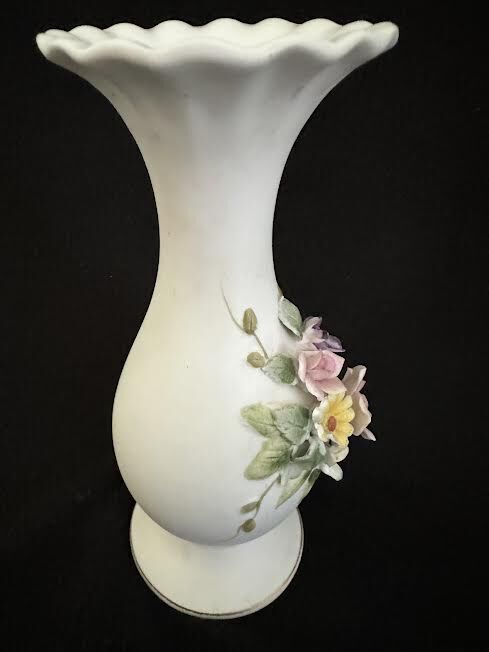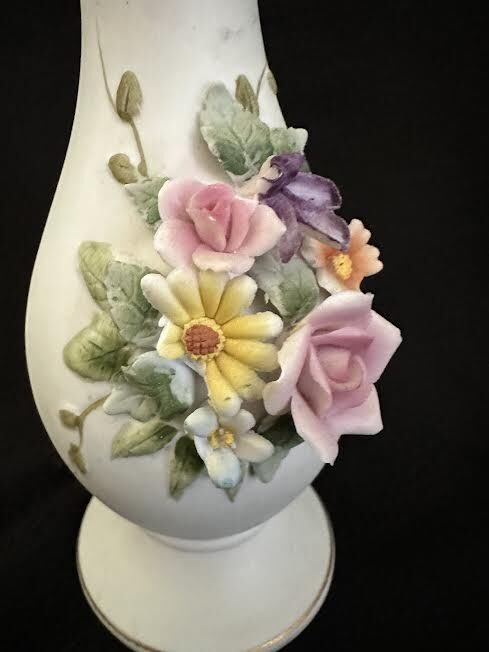 VenmoVintage Lefton hand painted bud vase. Made in Japan KW829. Bisque white porcelain. Colorful raised floral arrangement on green leaf background. Three flower petals have a small chip. Fluted rim. Height 6-3/4” x 2-1/2” base. Weight 8.5 oz. Original label attached.