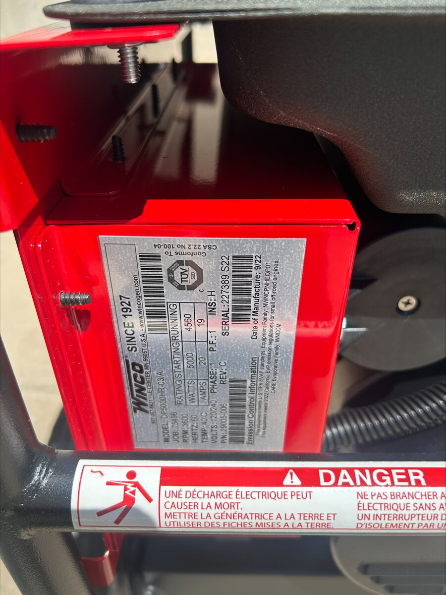New Winco 5000 watt generator, honda engine with wheel kit!