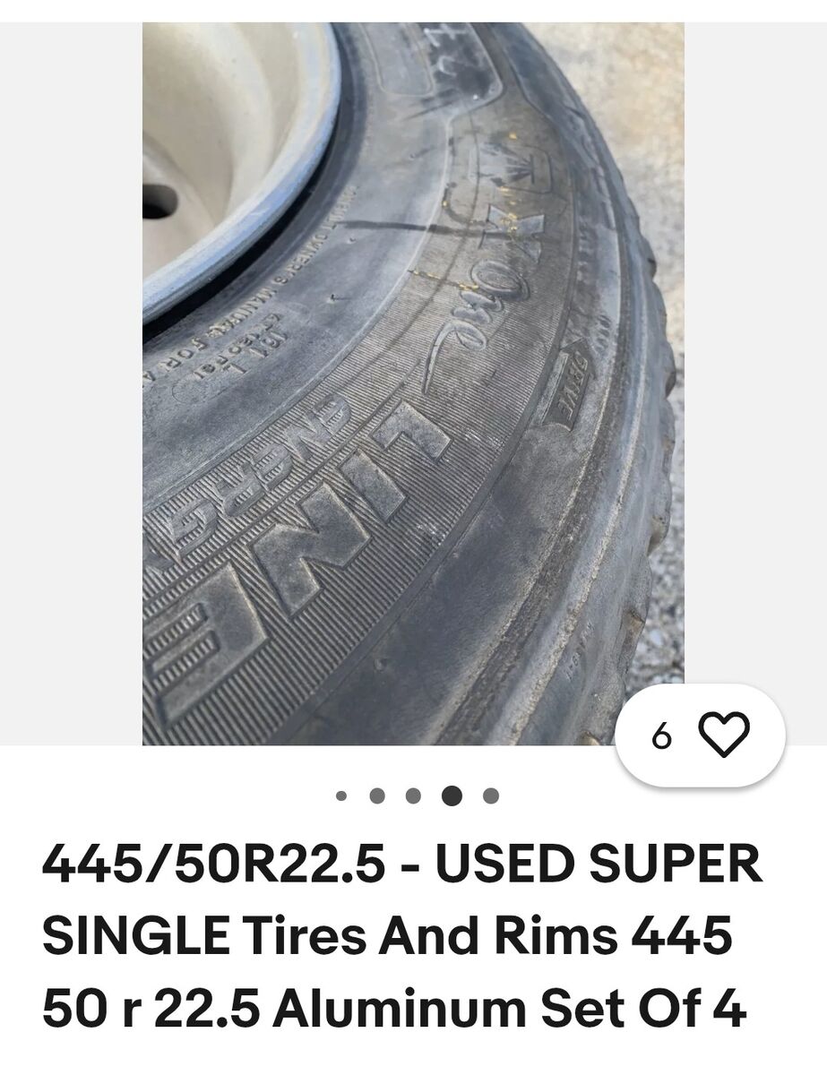 445/50R22.5 Super Single tires and rims 445 50 r 22.5 aluminum set of 4 tred on tires is 11/32 11/32 6/32 9/32