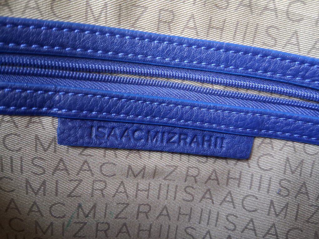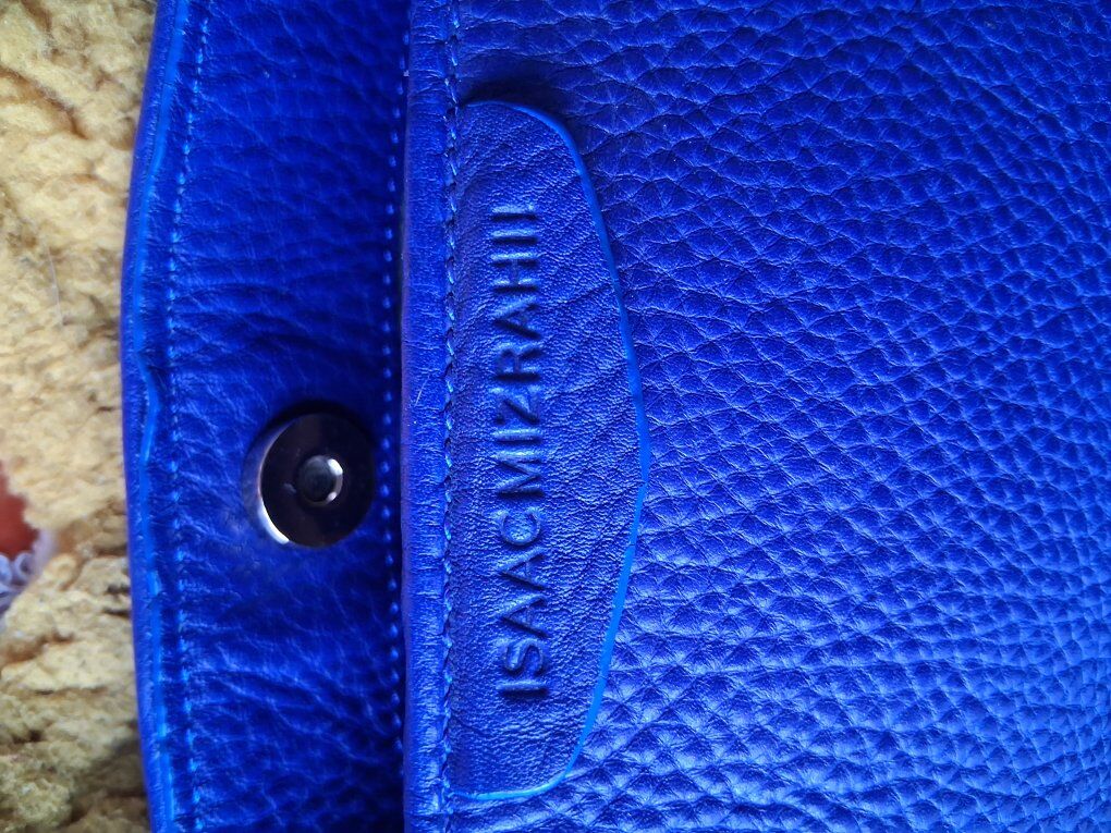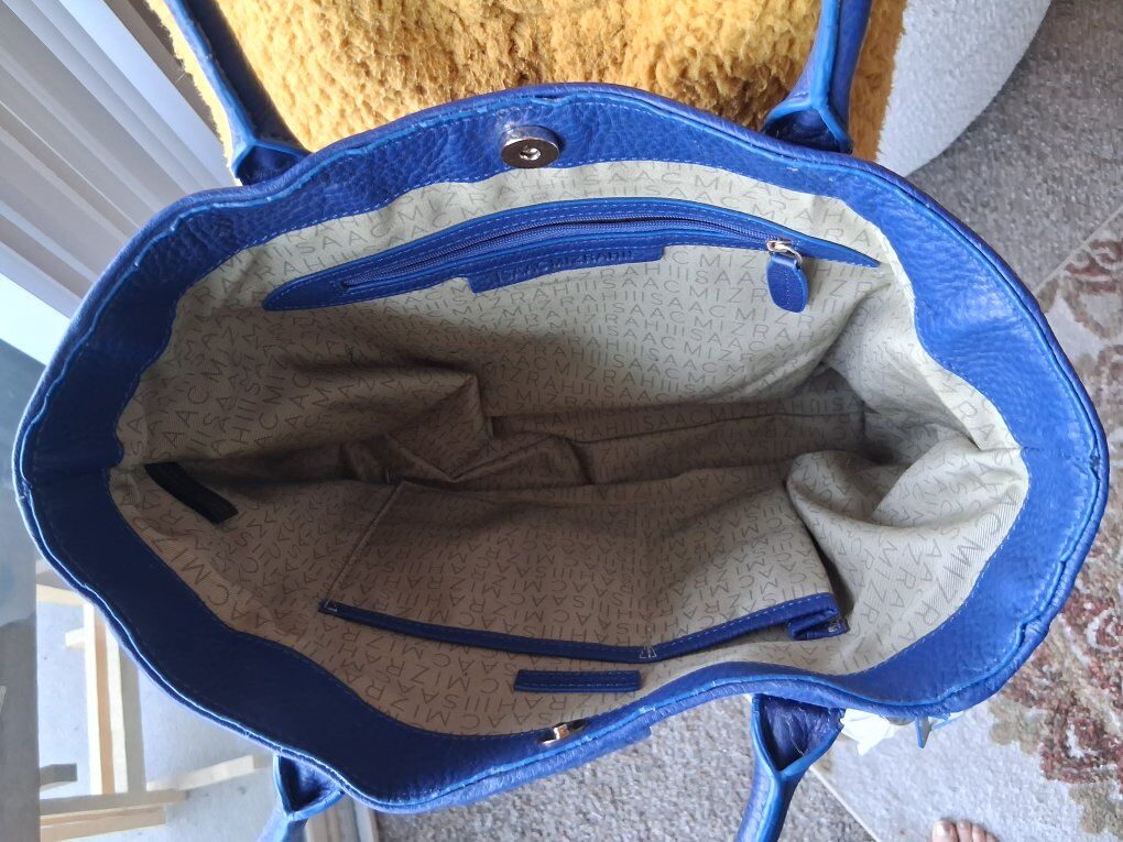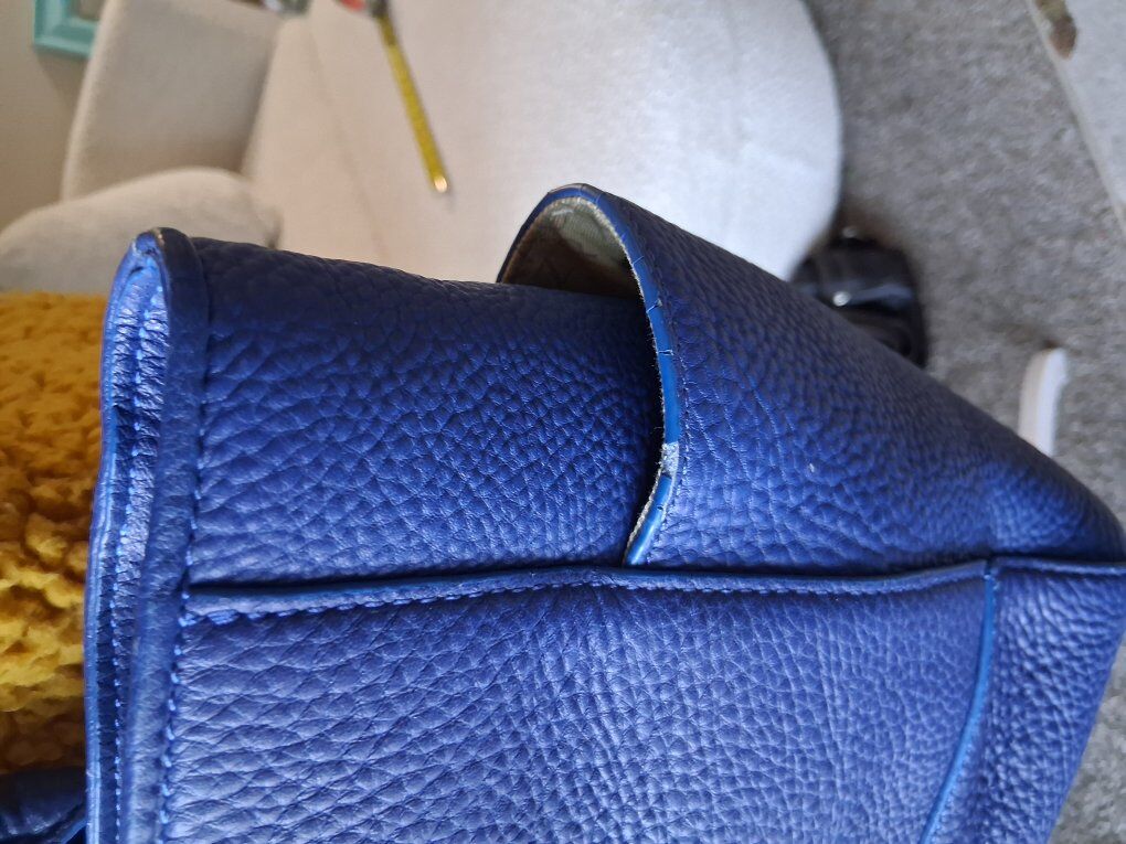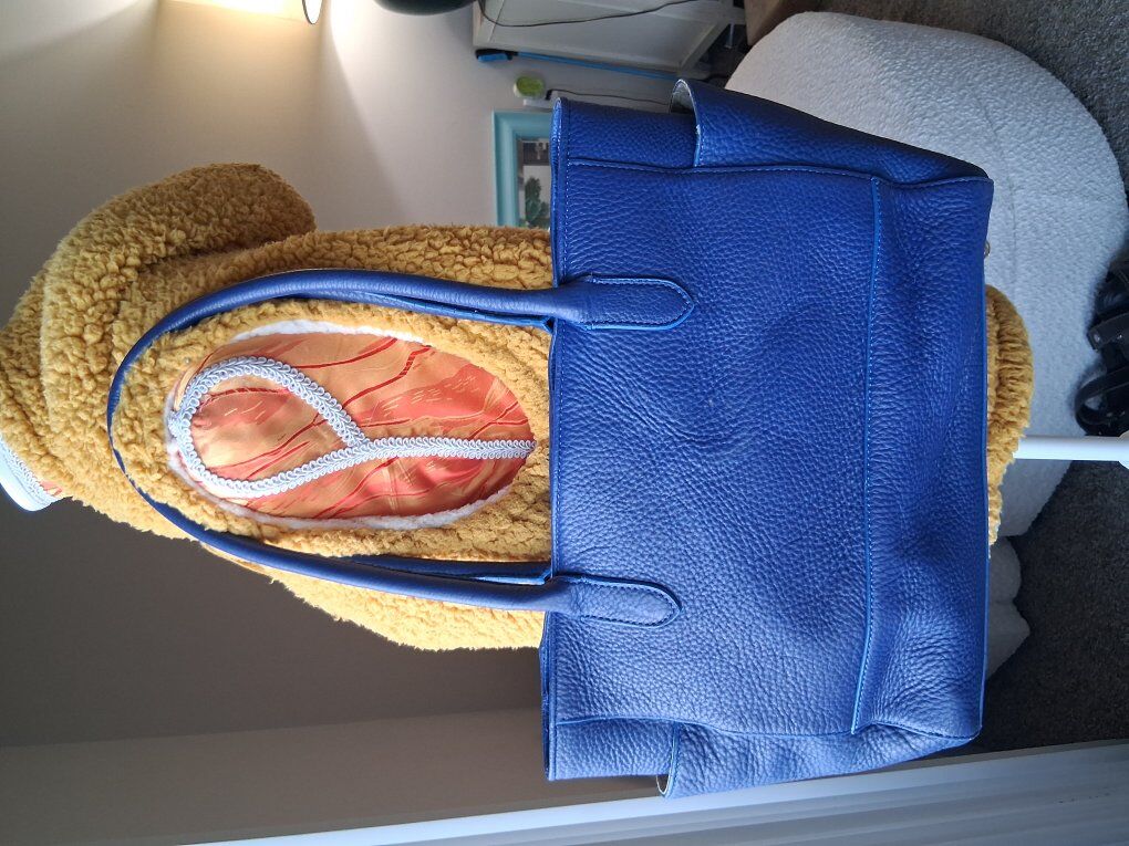 Soft thick blue leather, beige logo liner. Double top, leather handles. Metal feet, magnetic closure.
