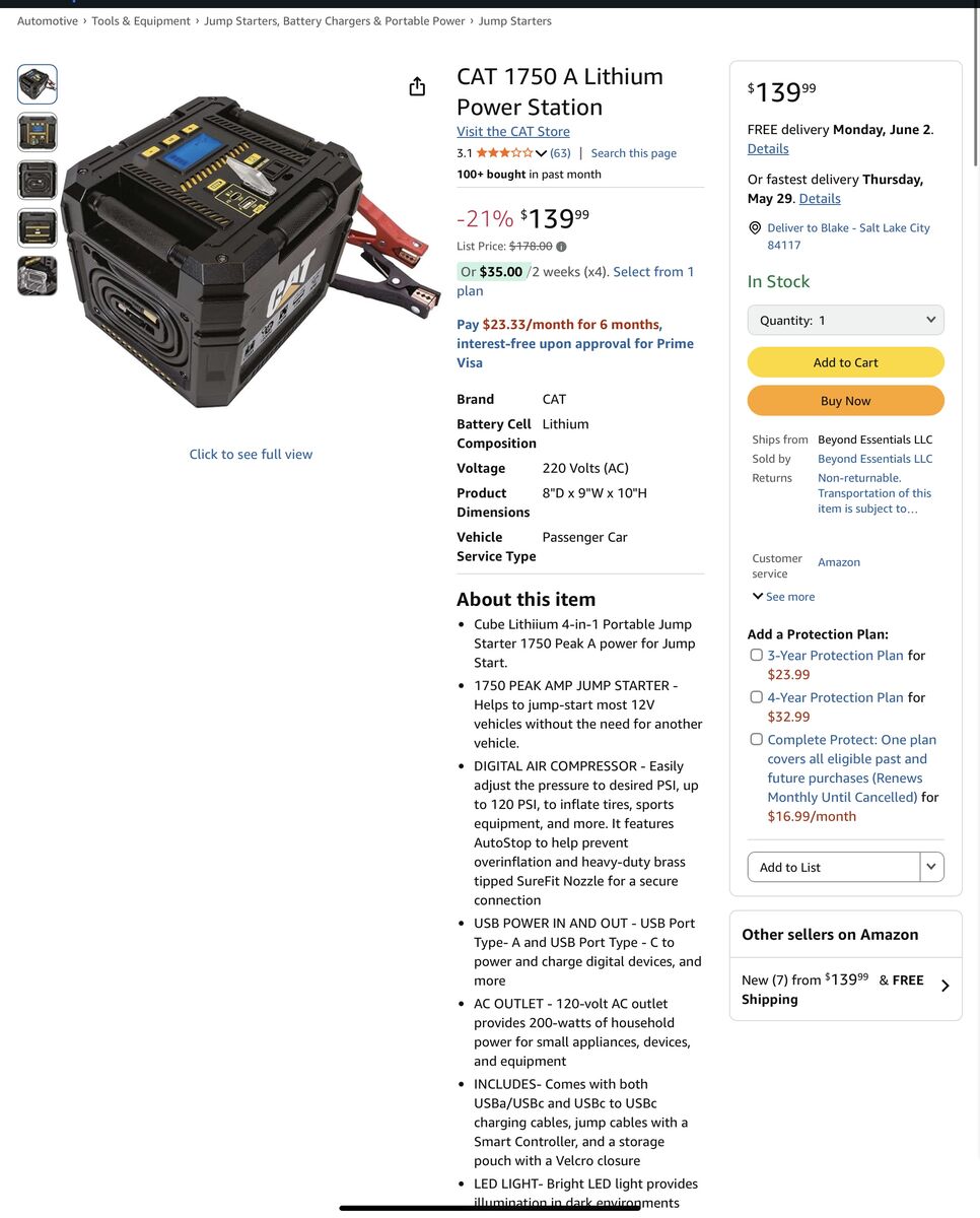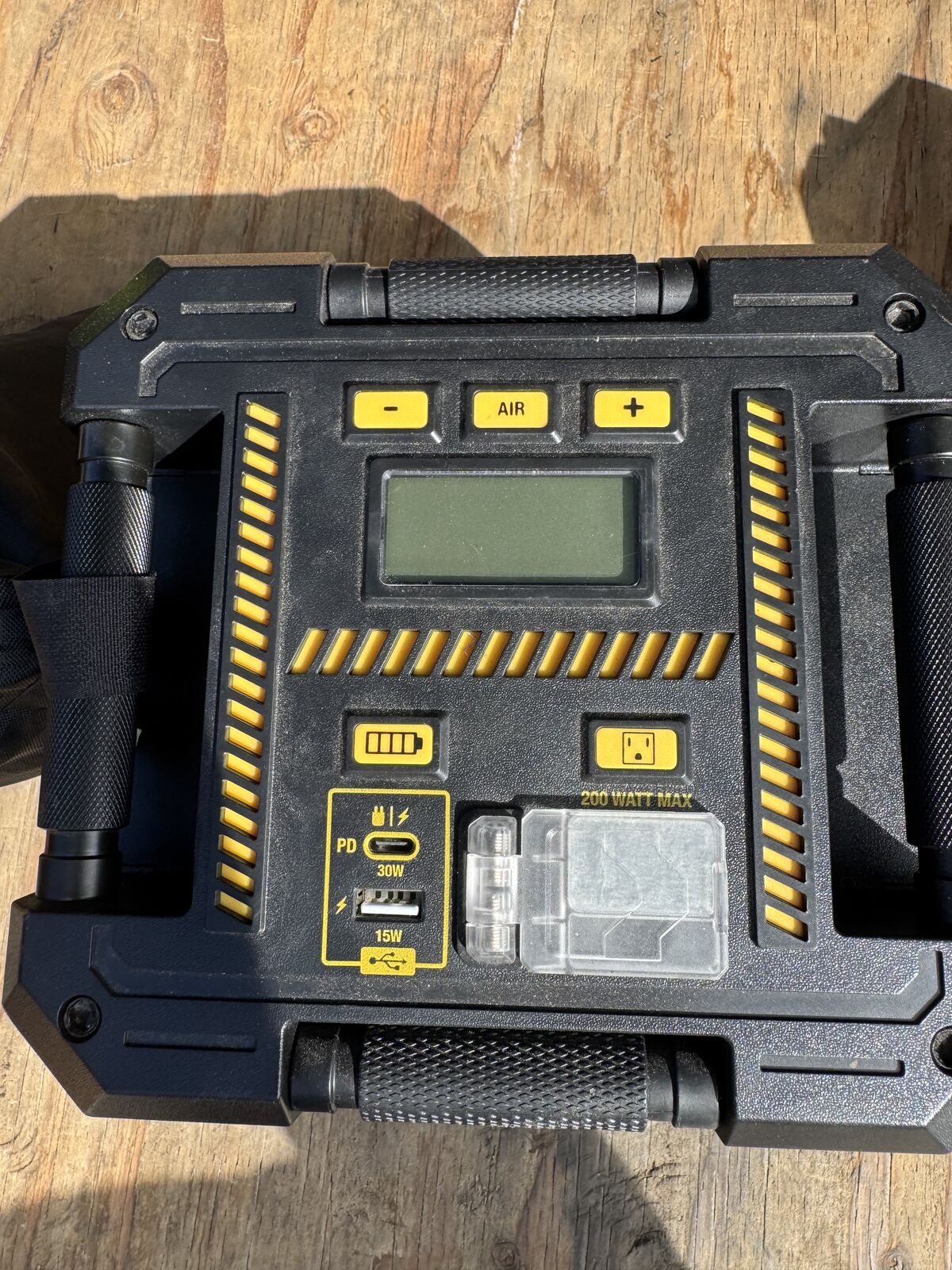 Description from website: Cube Lithiium 4-in-1 Portable Jump Starter 1750 Peak A power for Jump Start. 1750 PEAK AMP JUMP STARTER - Helps to jump-start most 12V vehicles without the need for another vehicle. DIGITAL AIR COMPRESSOR - Easily adjust the pressure to desired PSI, up to 120 PSI, to inflate tires, sports equipment, and more. It features AutoStop to help prevent overinflation and heavy-duty brass tipped SureFit Nozzle for a secure connection USB POWER IN AND OUT - USB Port Type- A and USB Port Type - C to power and charge digital devices, and more AC OUTLET - 120-volt AC outlet provides 200-watts of household power for small appliances, devices, and equipment INCLUDES- Comes with both USBa/USBc and USBc to USBc charging cables, jump cables with a Smart Controller, and a storage pouch with a Velcro closure LED LIGHT- Bright LED light provides illumination in dark environments