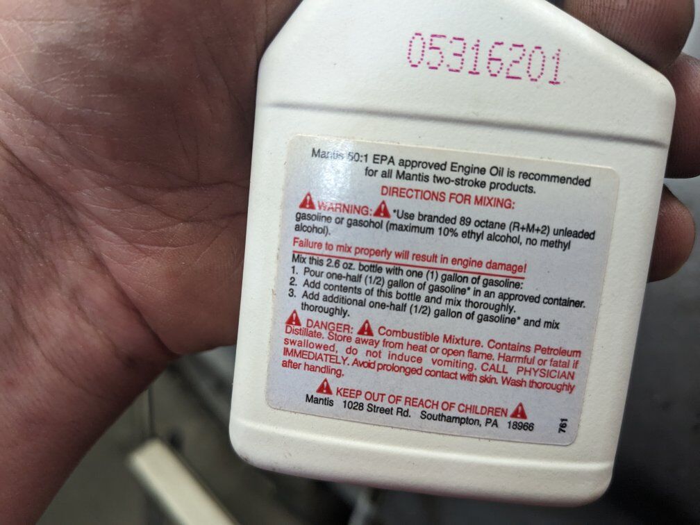 Four bottles of genuine Mantis 2-stroke tiller oil.