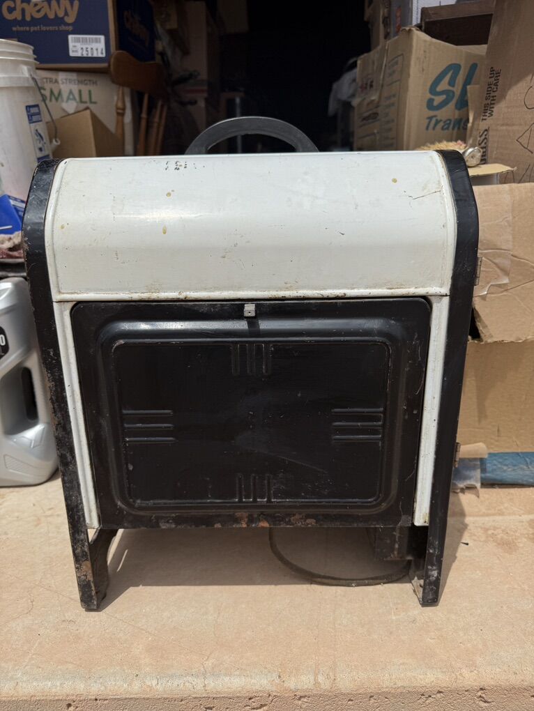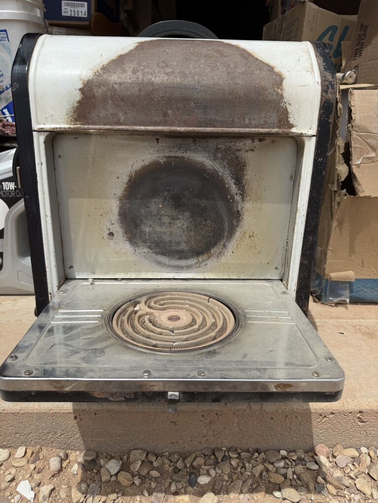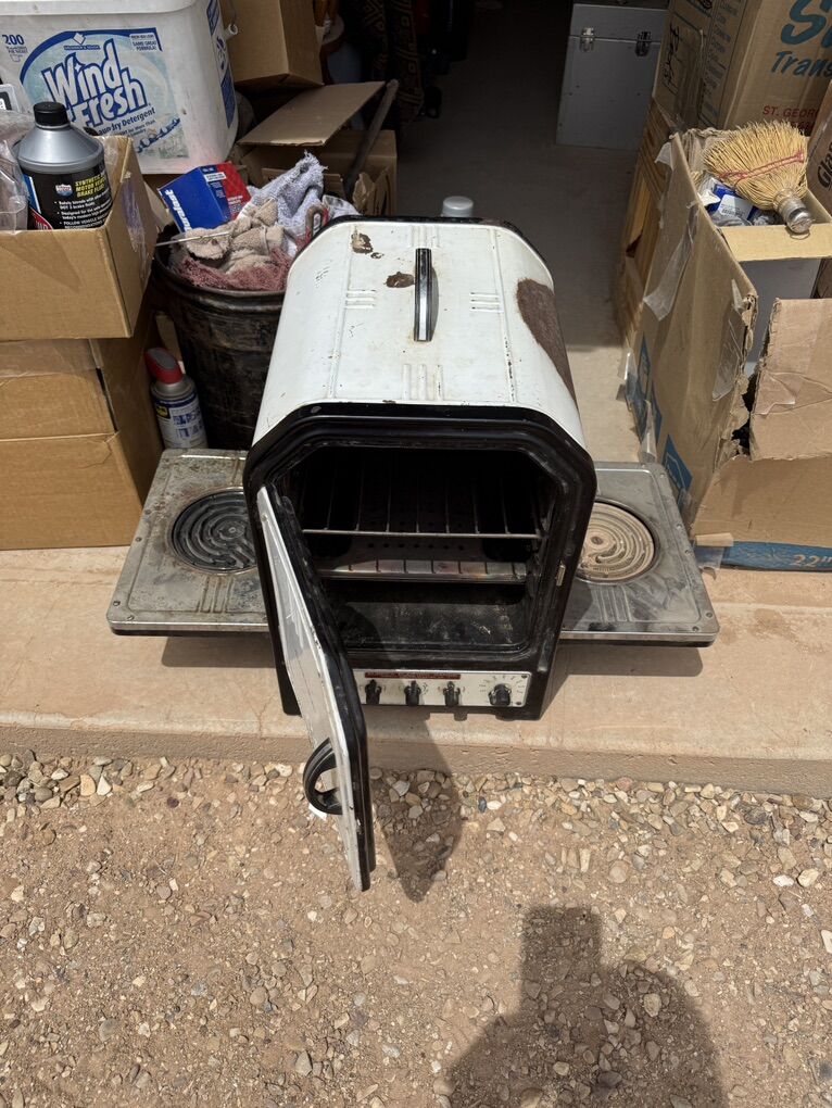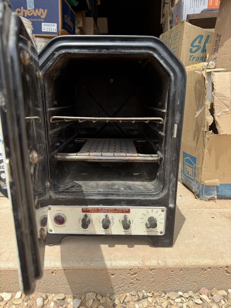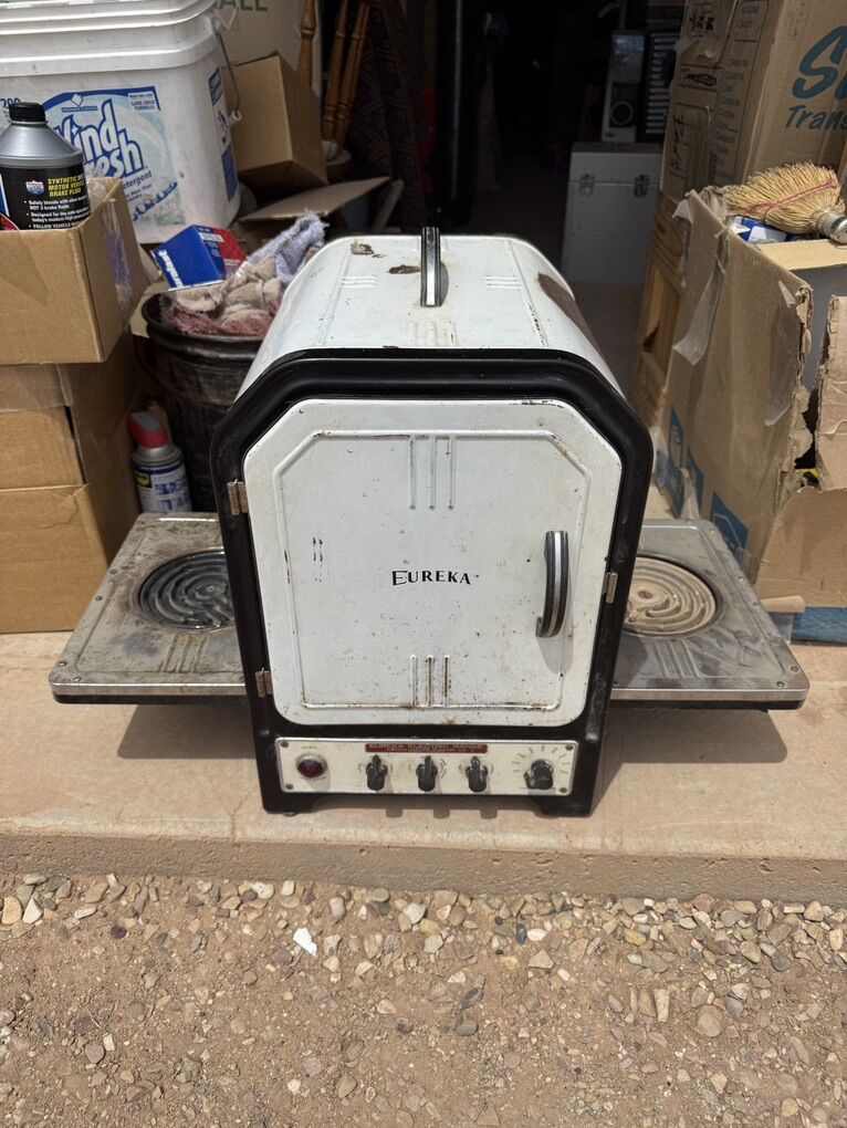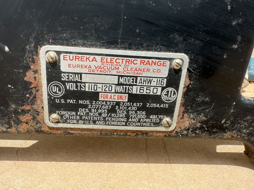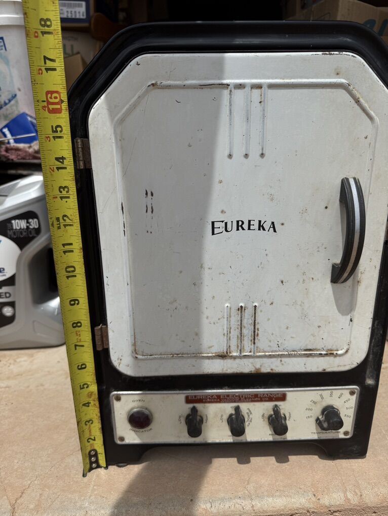 ApplePayEureka Electric Range Model AHW-116, manufactured in 1937, is a countertop appliance. Fully functional with no missing parts, but recommend replacing the original power cord as cloth insulation is frayed. This piece features bakelite knobs and fold up electric burners as well as a central oven with rack. These appliances were built to last and they sure did.