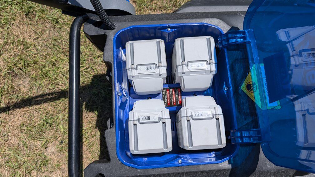 Cordless, battery powered 96 volt snow blower. In great shape. Batteries in great shape. comes with four 24v lithium batteries and two 2 place chargers (4 spots). Motorized blower flow director.
