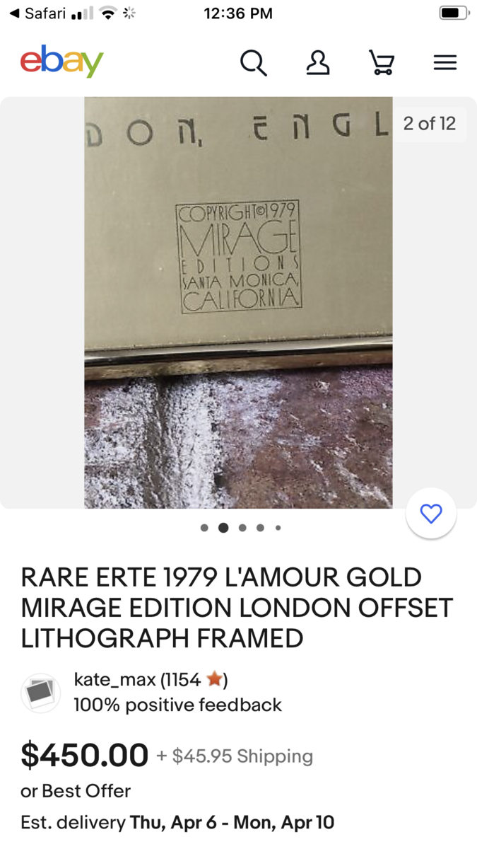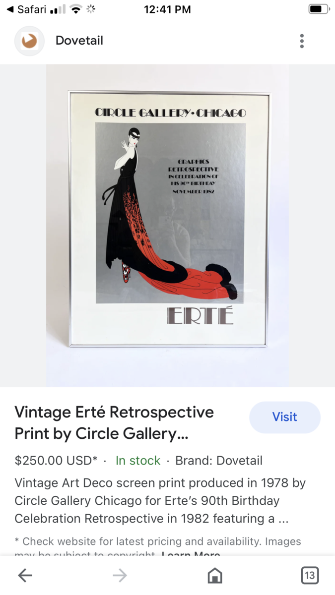 VenmoBeautiful Vintage Art - Erte Gold 1970’s Lithograph Mirage Edition - Framed Art Poster Art Deco. Rhe print with the gold background just sold. The framed print with the black and red dress is available