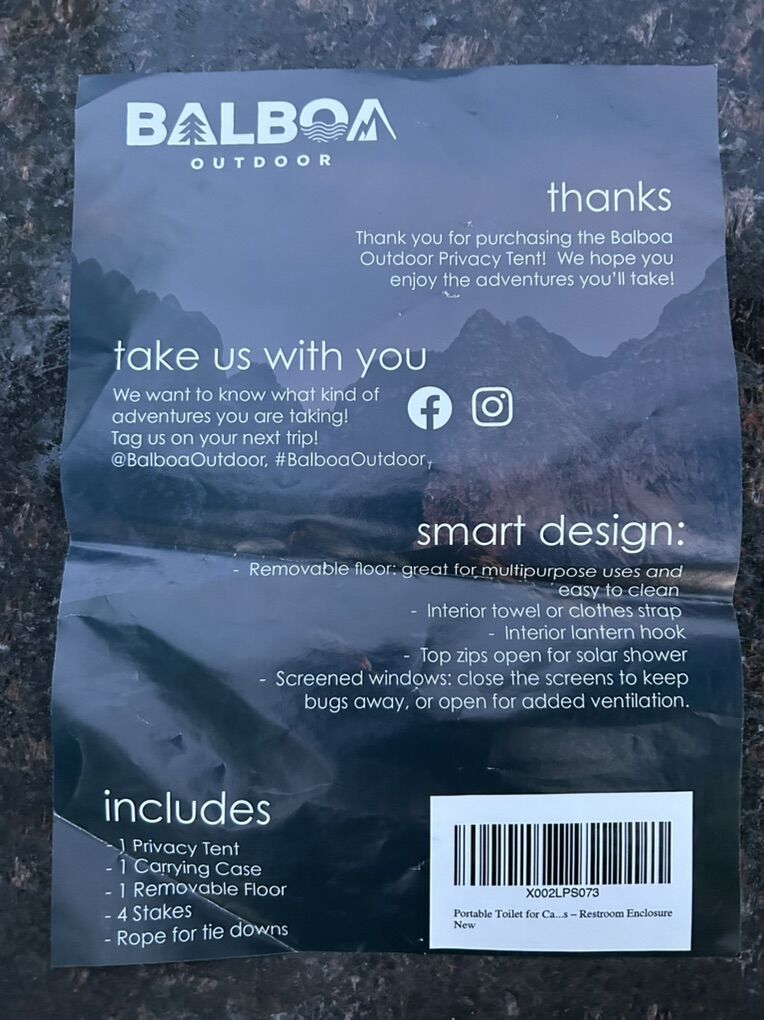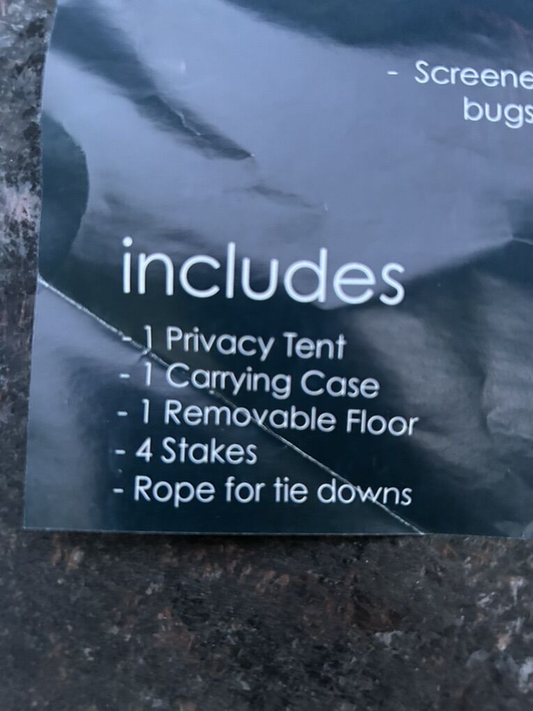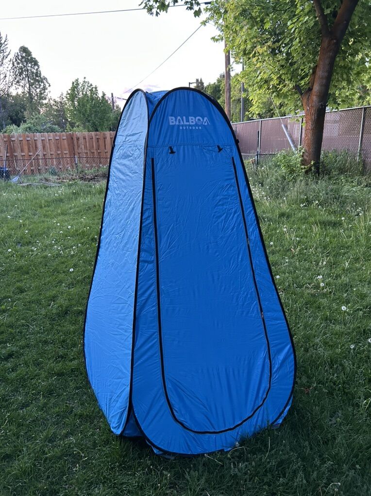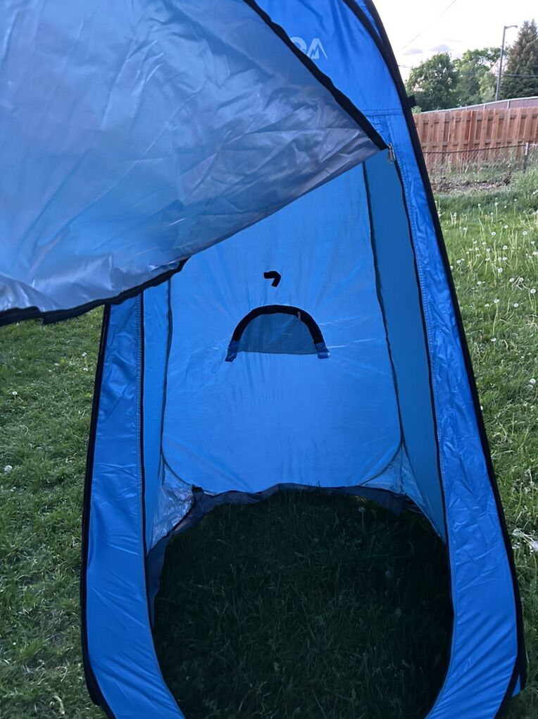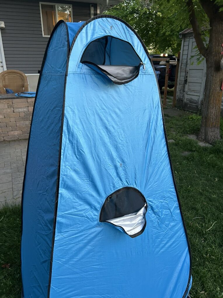 This brand new privacy tent features: •Netting/screens on all three windows, which means you can shower, change or use the restroom without bugs flying in. •Removable floor that you can easily wash or shake off. •UV coated interior which blocks sun and adds privacy - leaving you with clean and happy campers. •A “sunroof” through which a solar shower system could be inserted. •Handy case with straps for easy transport.