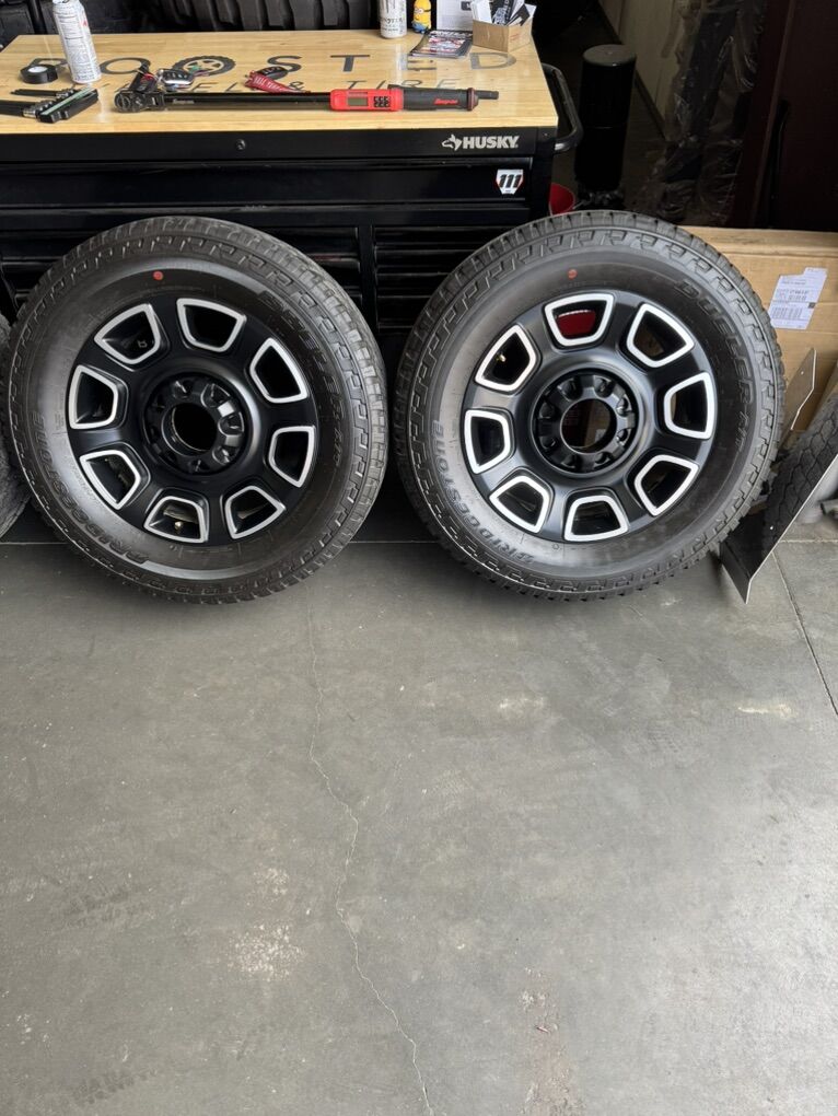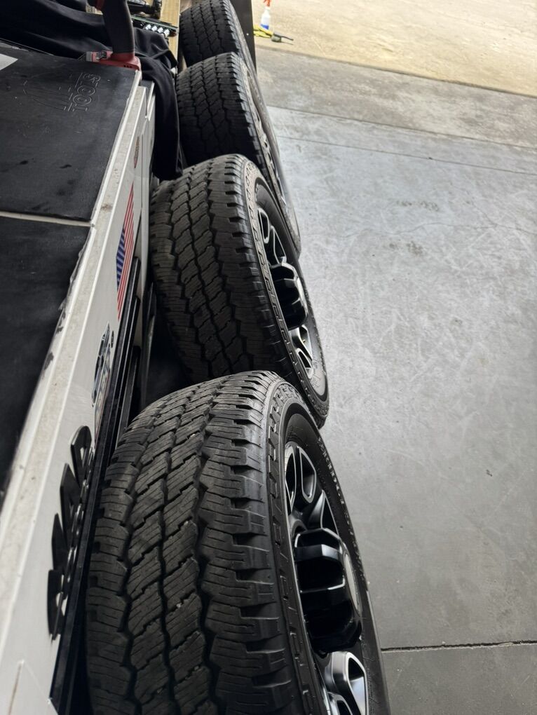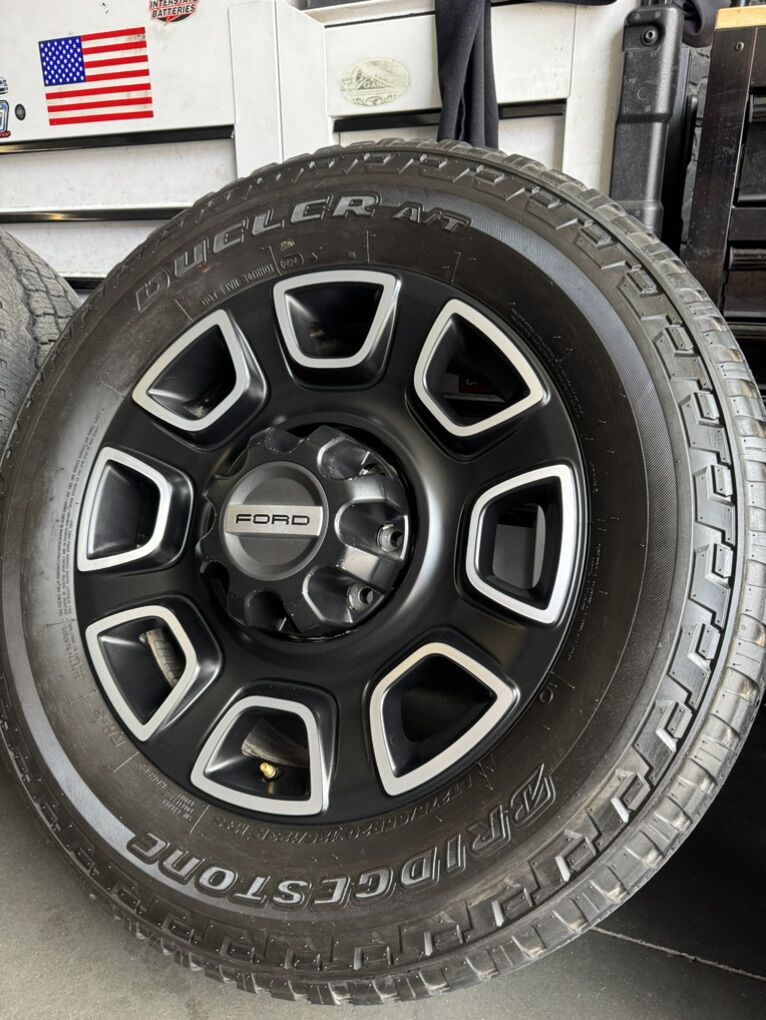 Wheels are 20in OEM wheels off a 2024 ford f350 platinum package. Wheels are in perfect condition, No curb rash, dings or damage on them, center caps are also included and in Greta shape as well. I also have lug nuts if needed. Tires are 275/65/20 Bridgestone dueler, all terrain, load range E, top of the line tires. No patches or plugs, low miles on them, tire have about 80% tread left.