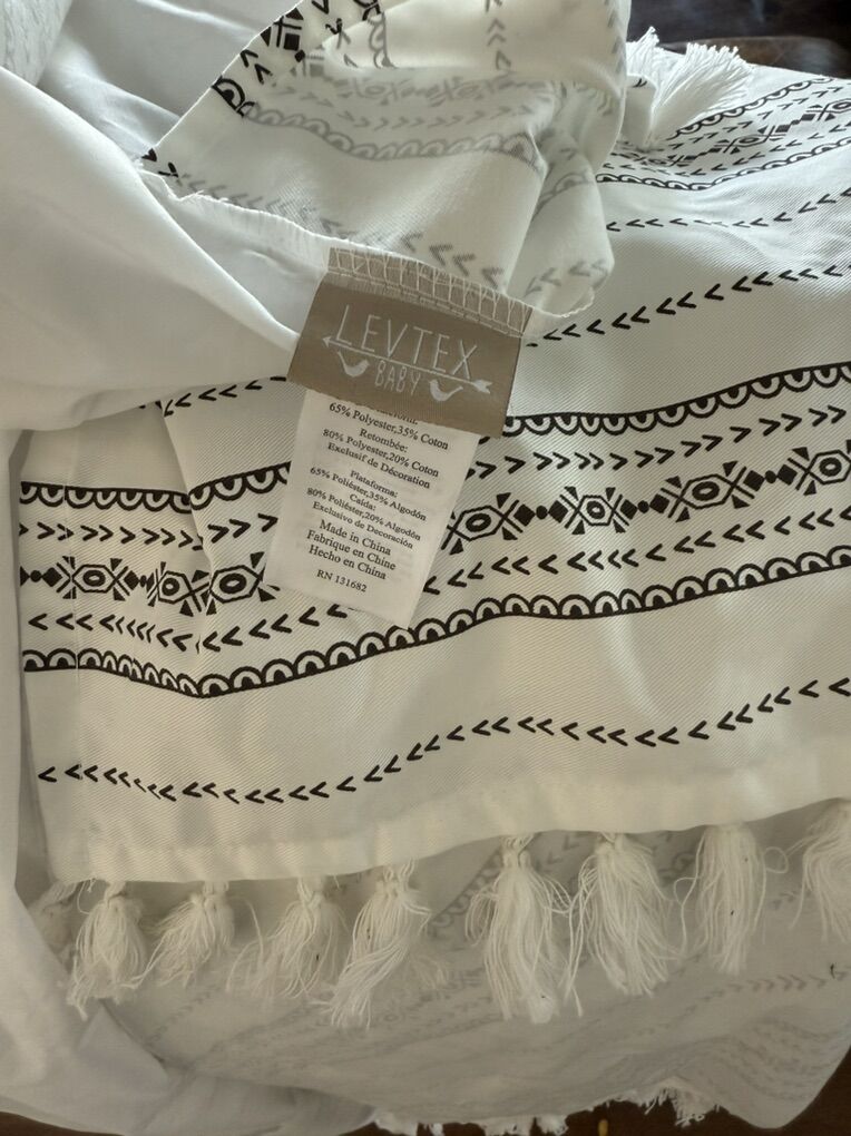 Levtex baby brand crib dust ruffle bohemian style with fringed edge. Brown and white