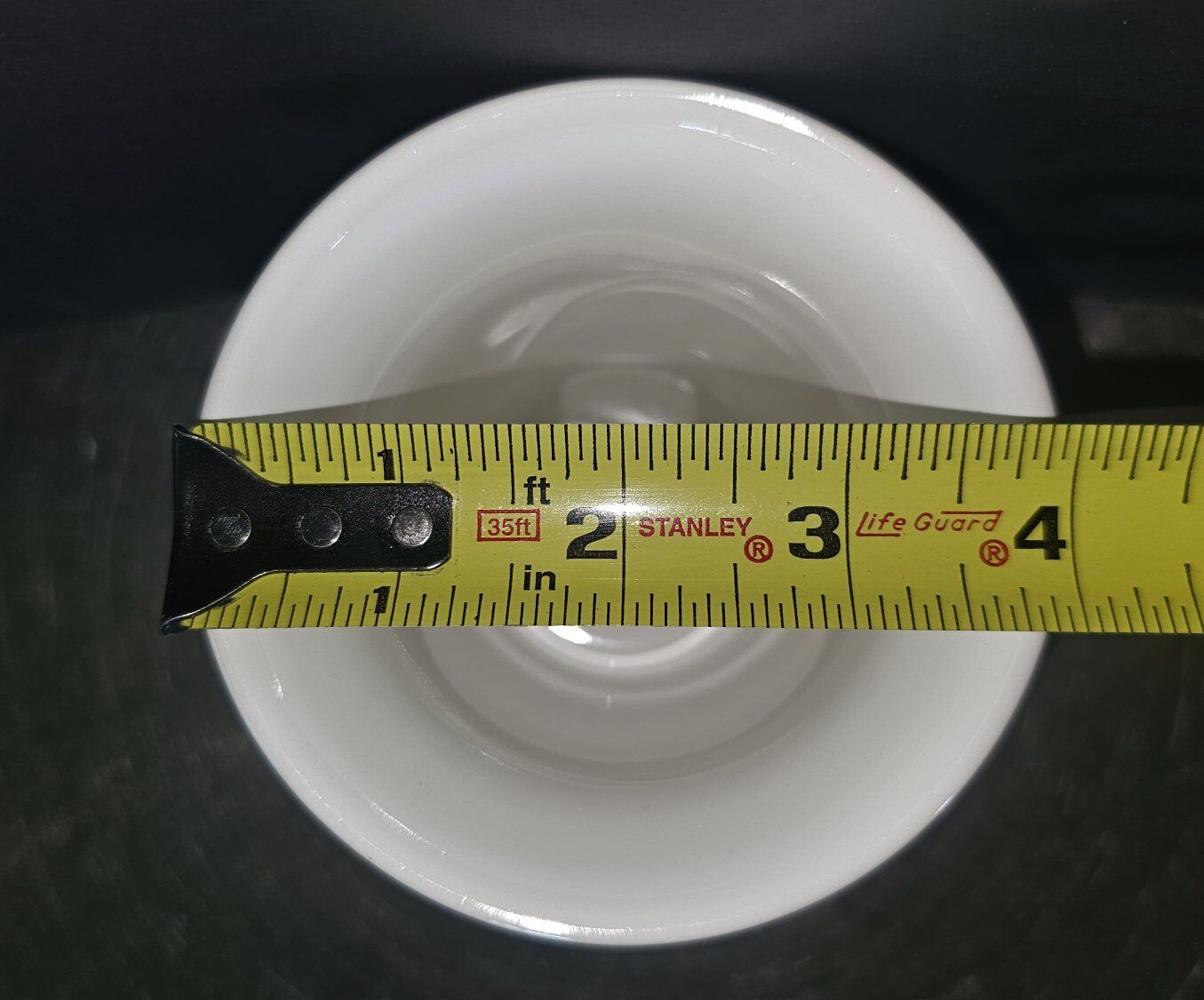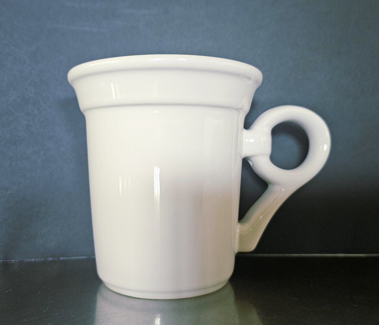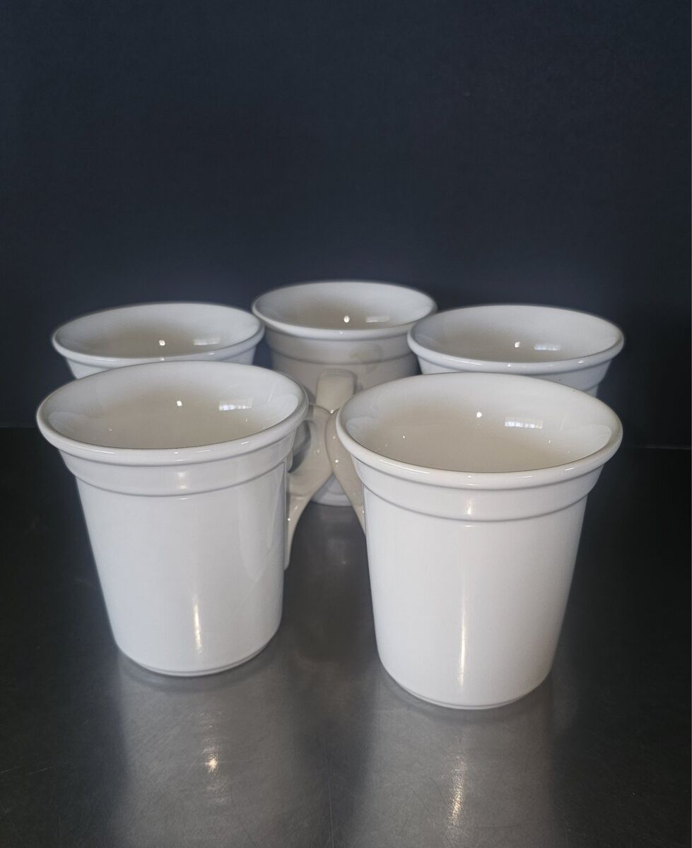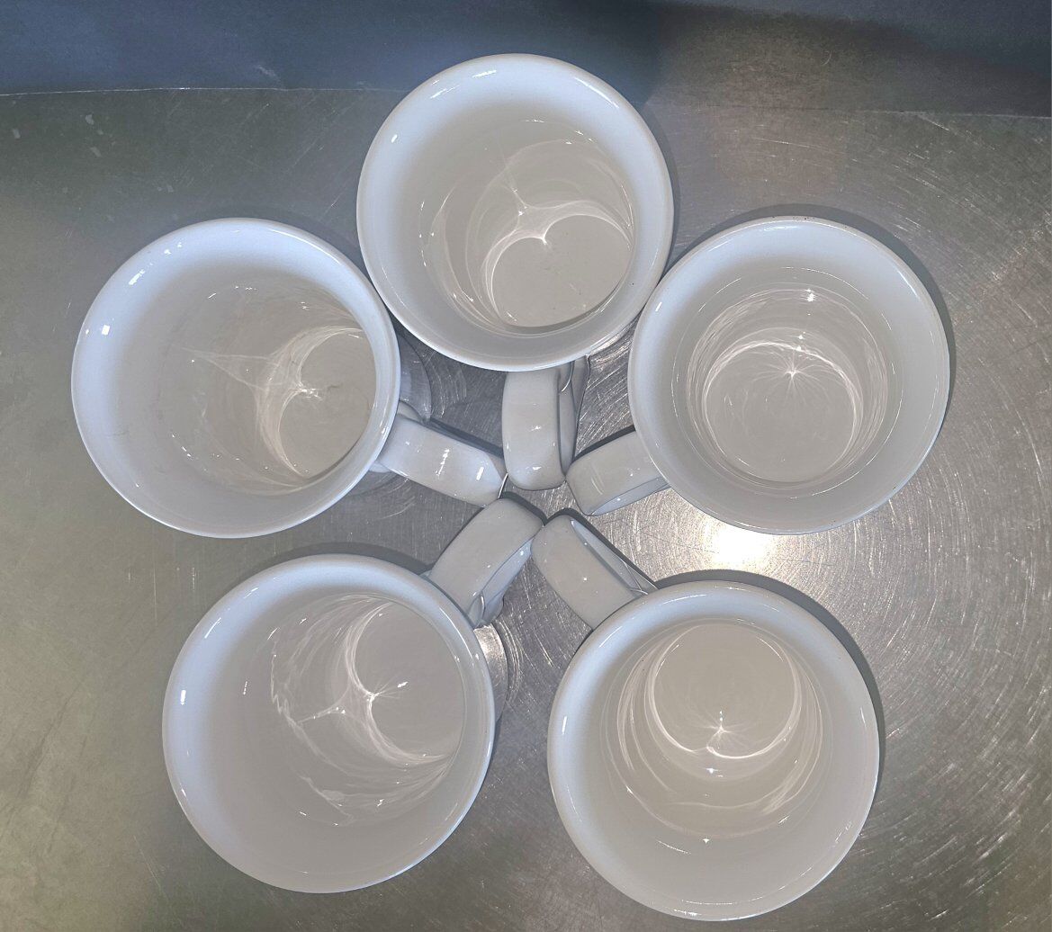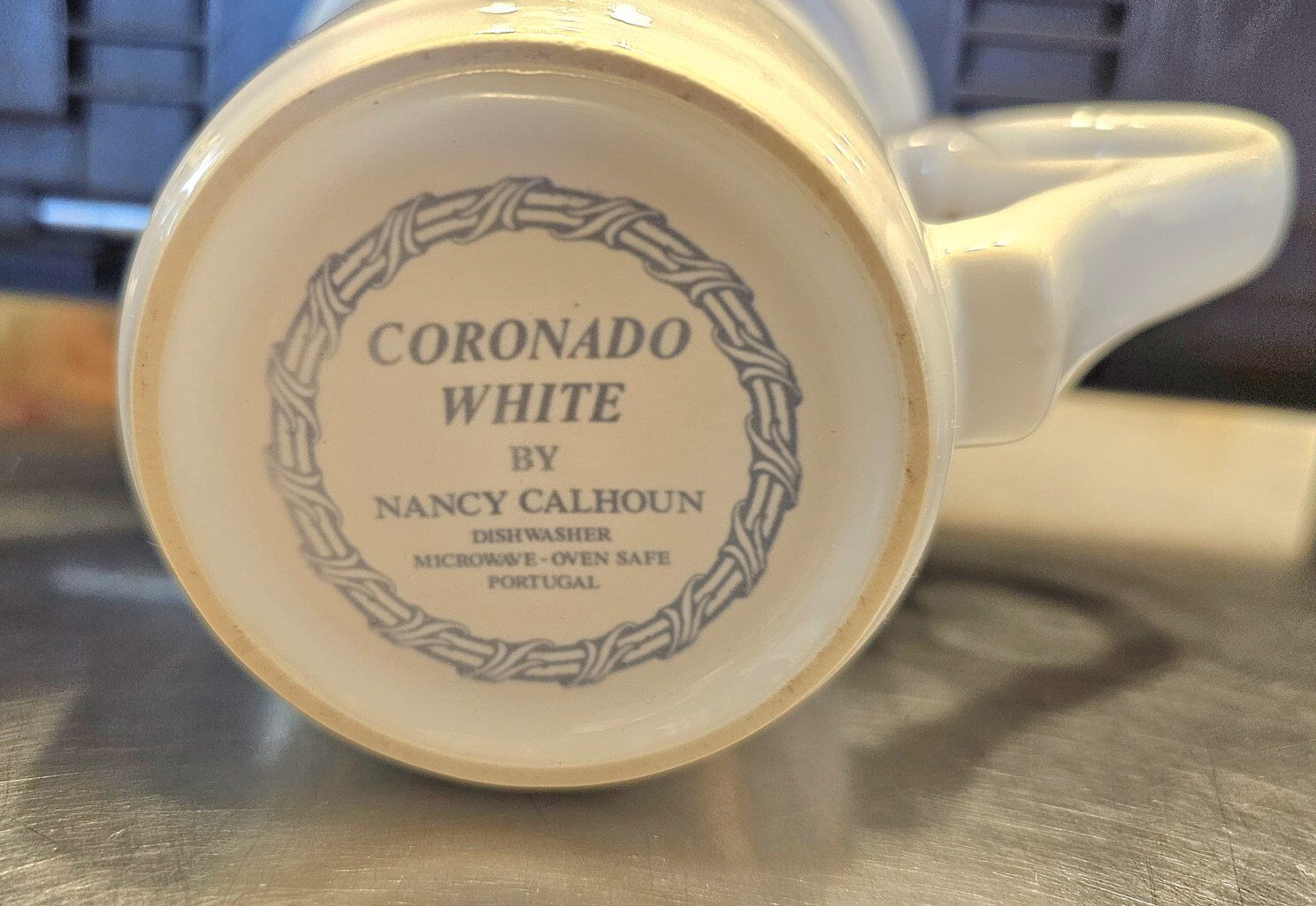 Vintage NANCY CALHOUN MUGS 'Coronado' all white, (except blue maker mark on bottom) made in Portugal. Set of 5 smooth, glossy ceramic cups with a ring handle and a sculpted rim.