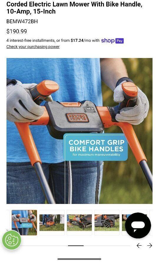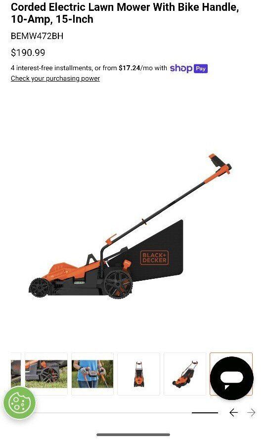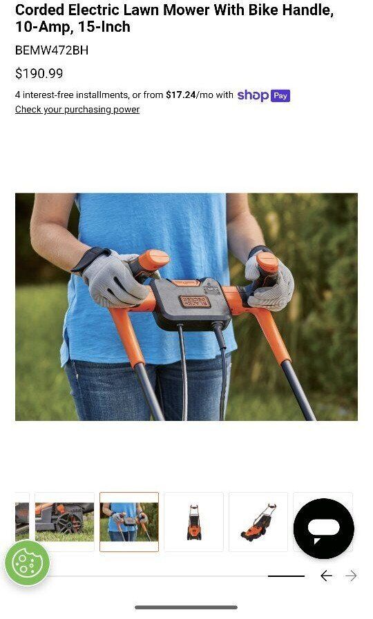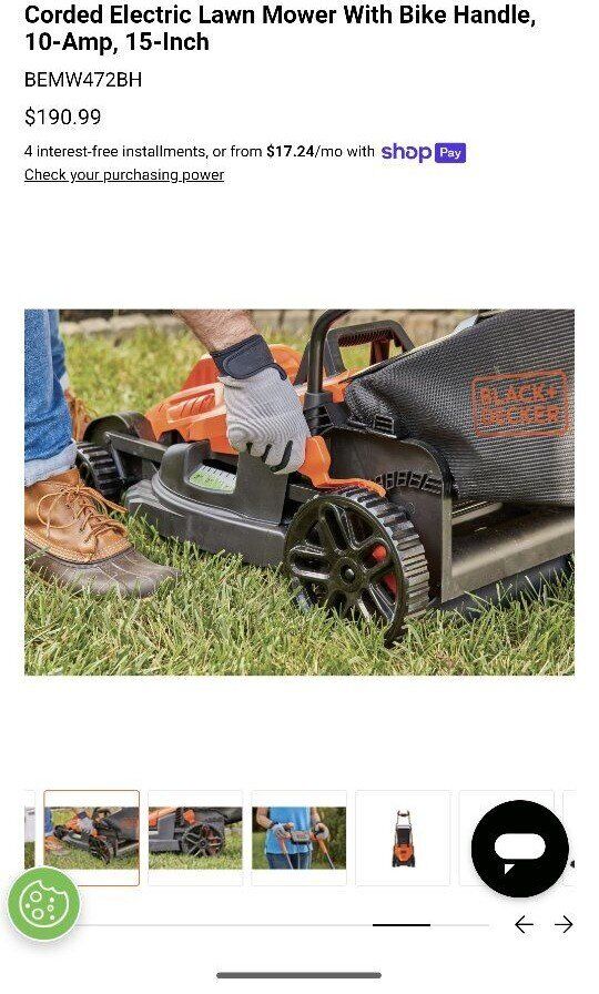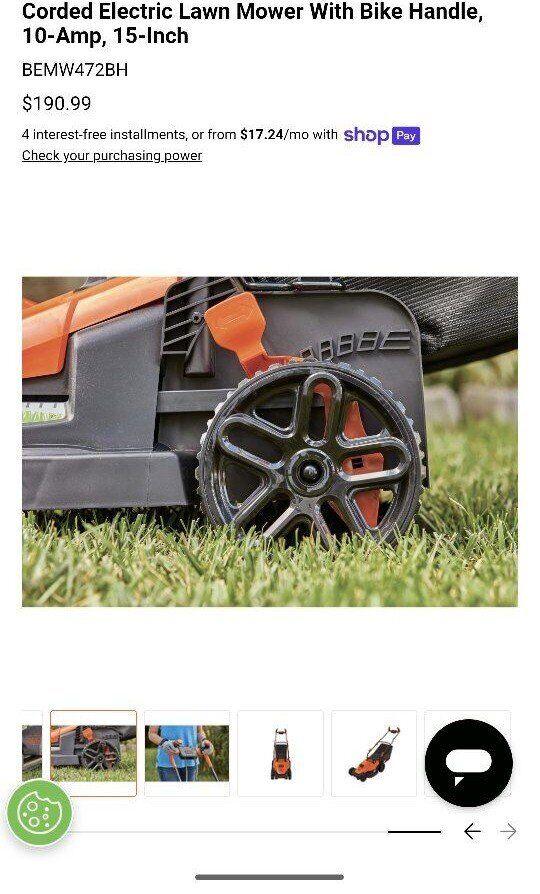 ZelleThis mower was purchased from Walmart and is in excellent condition with no imperfections: www.walmart.com/ip/BLACK-DECKER-BEMW472BH-10AMP-15-Electric-Mowe-Lightweight-easy-maneuver-electric-lawn-mower-features-Comfort-Grip-Handle-peak-performance-Winged-Blad/875278231?wmlspartner=wlpa&selectedSellerId=101468141&selectedOfferId=0D6E2F3A161F3C9BA1AC1B593C7A811D&conditionGroupCode=1&sourceid=dsn_ad_fac153e8-a819-4e04-9af5-1c5d04a29929&veh=dsn&wmlspartner=dsn_ad_fac153e8-a819-4e04-9af5-1c5d04a29929&cn=FY26-MP-PMax_cnv_dps_dsn_dis_ad_mp_s_n&gclsrc=aw.ds&wl9=pla&wl11=online&gad_source=1&gad_campaignid=22532405497&gbraid=0AAAAADmfBIq7VJpzqaXb7lDA6oHV9JSe_&gclid=Cj0KCQjwotDBBhCQARIsAG5pinM5gC96RPFdz6VQ4qLzr_Dv46YeJlMF5LlPVckherE6HNqILM0iW54aAuIMEALw_wcB#Intent;scheme=https;package=com.walmart.android;S.browser_fallback_url=https://www.walmart.com/ip/BLACK-DECKER-BEMW472BH-10AMP-15-Electric-Mowe-Lightweight-easy-maneuver-electric-lawn-mower-features-Comfort-Grip-Handle-peak-performance-Winged-Blad/875278231%3Fwmlspartner%3Dwlpa%26selectedSellerId%3D101468141%26selectedOfferId%3D0D6E2F3A161F3C9BA1AC1B593C7A811D%26conditionGroupCode%3D1%26sourceid%3Ddsn_ad_fac153e8-a819-4e04-9af5-1c5d04a29929%26veh%3Ddsn%26wmlspartner%3Ddsn_ad_fac153e8-a819-4e04-9af5-1c5d04a29929%26cn%3DFY26-MP-PMax_cnv_dps_dsn_dis_ad_mp_s_n%26gclsrc%3Daw.ds%26wl9%3Dpla%26wl11%3Donline%26gad_source%3D1%26gad_campaignid%3D22532405497%26gbraid%3D0AAAAADmfBIq7VJpzqaXb7lDA6oHV9JSe_;end