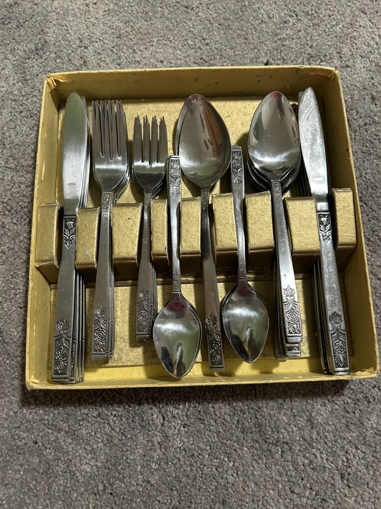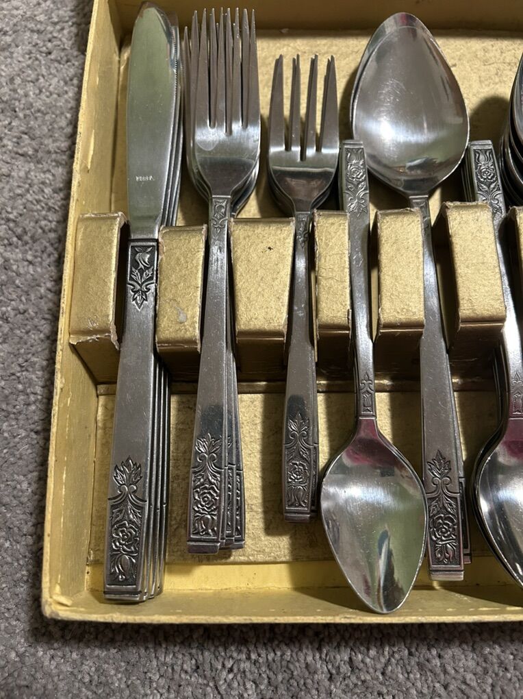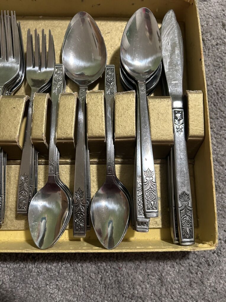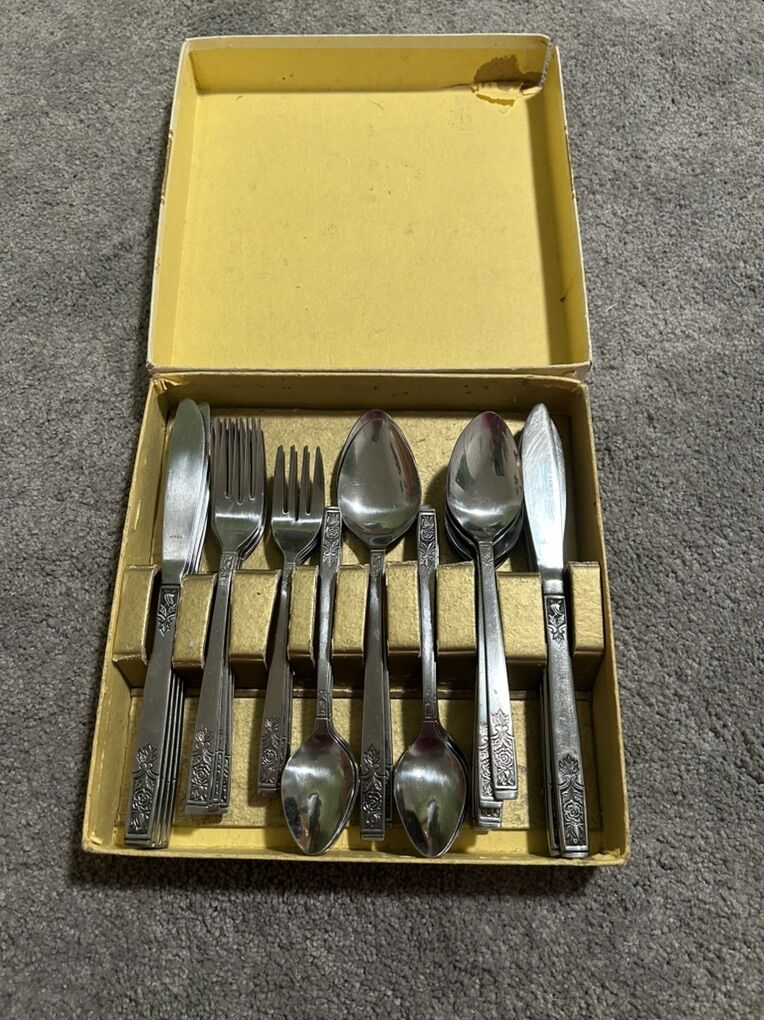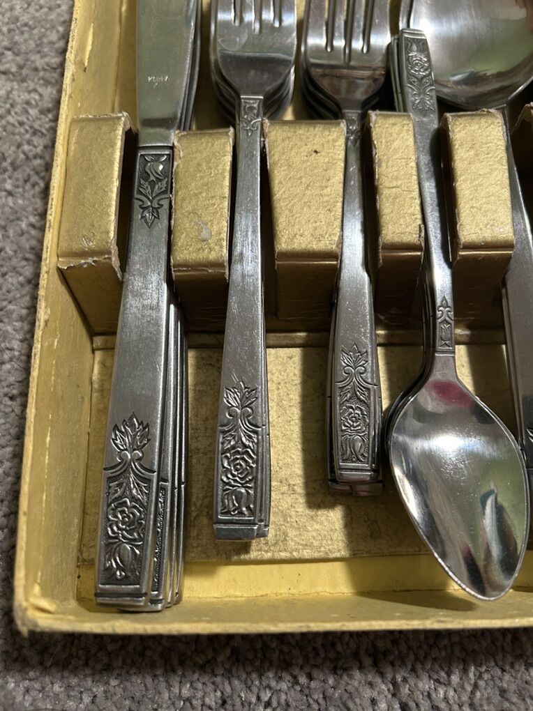 VenmoVintage Imperial Table Ware set Young Rose design Includes 8 Dinner Knives 8 Dinner Forks 6 salad forks 8 Soup Spoons 14 Teaspoons 2 serving spoons