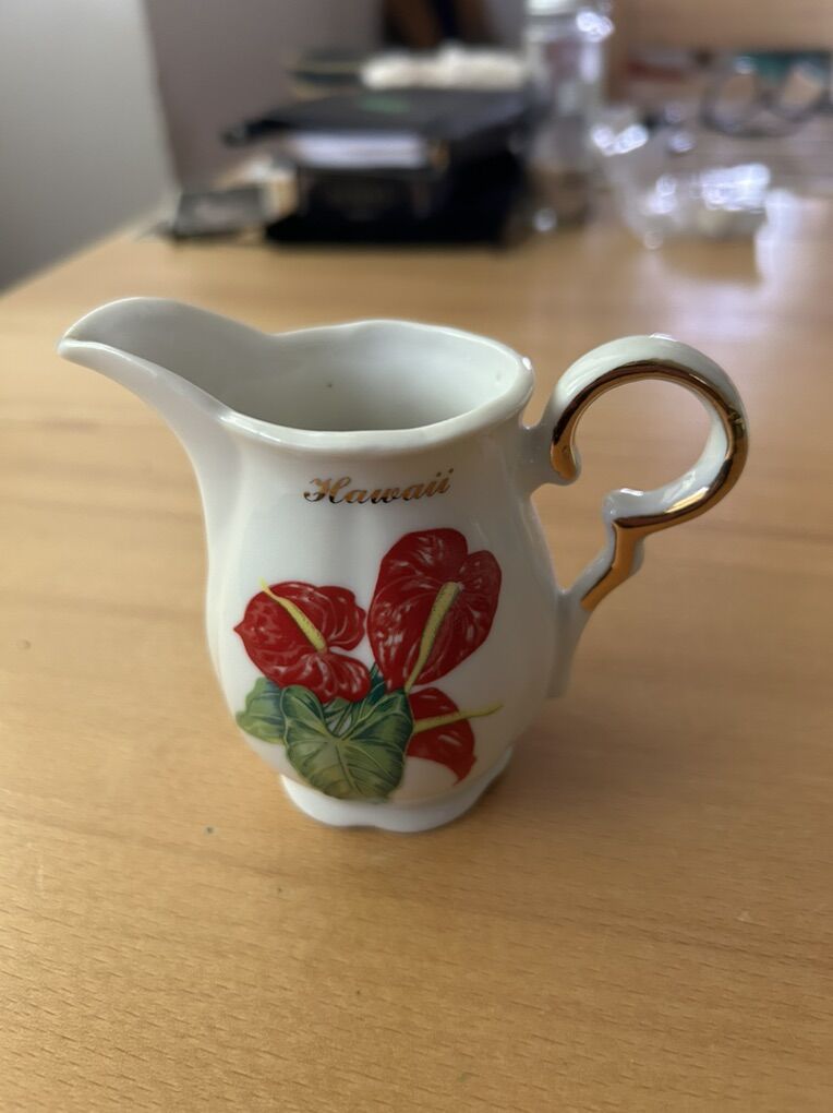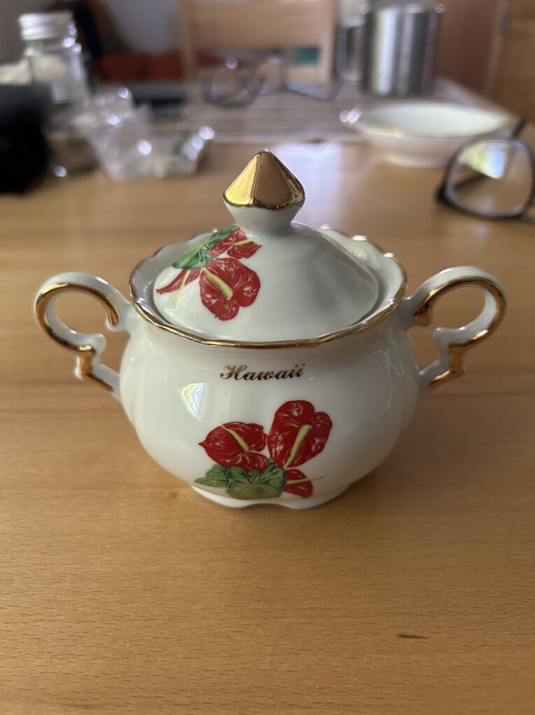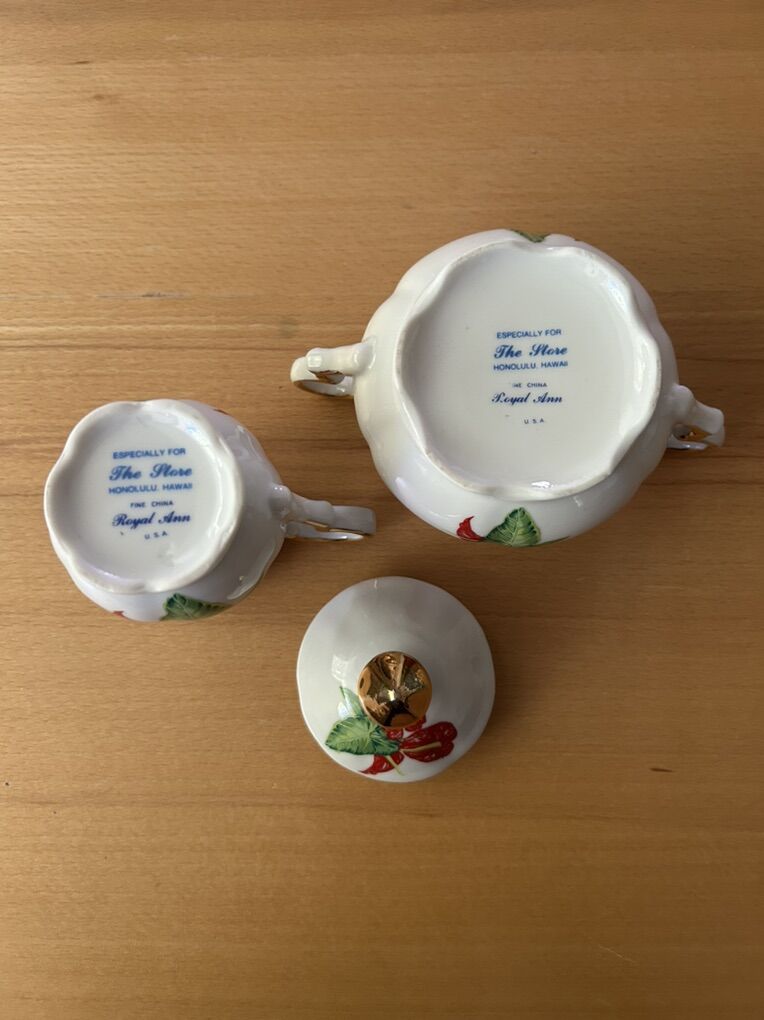 VenmoAloha! Here we have a near-perfect sugar & creamer set made by Royal Ann Fine China. The items are painted with a flamingo flower design, and both say “Hawaii” on them.