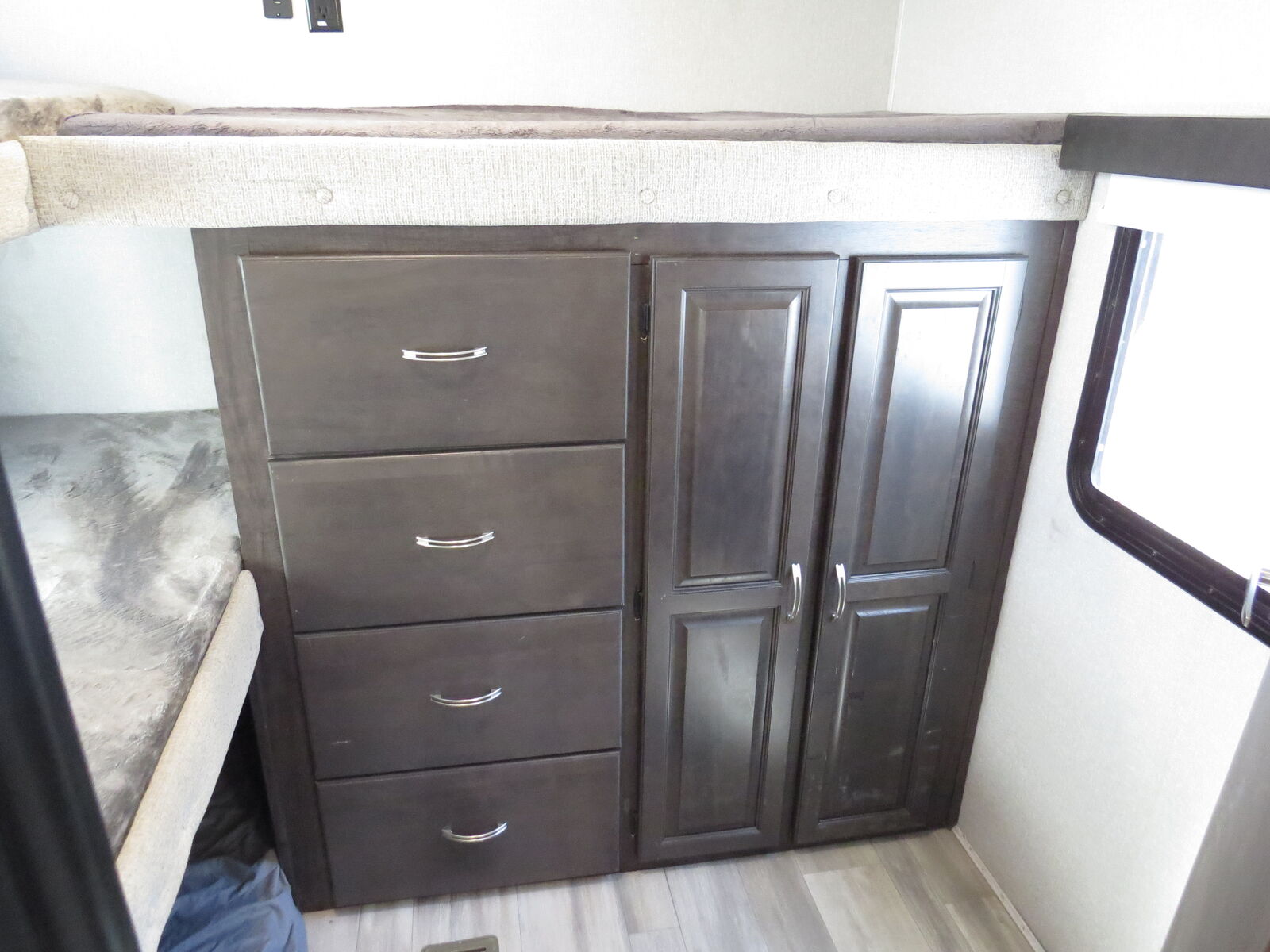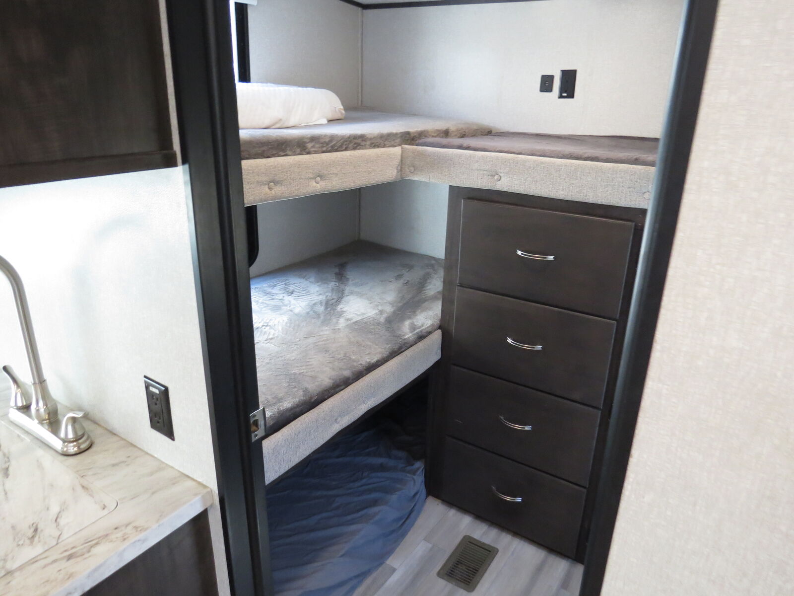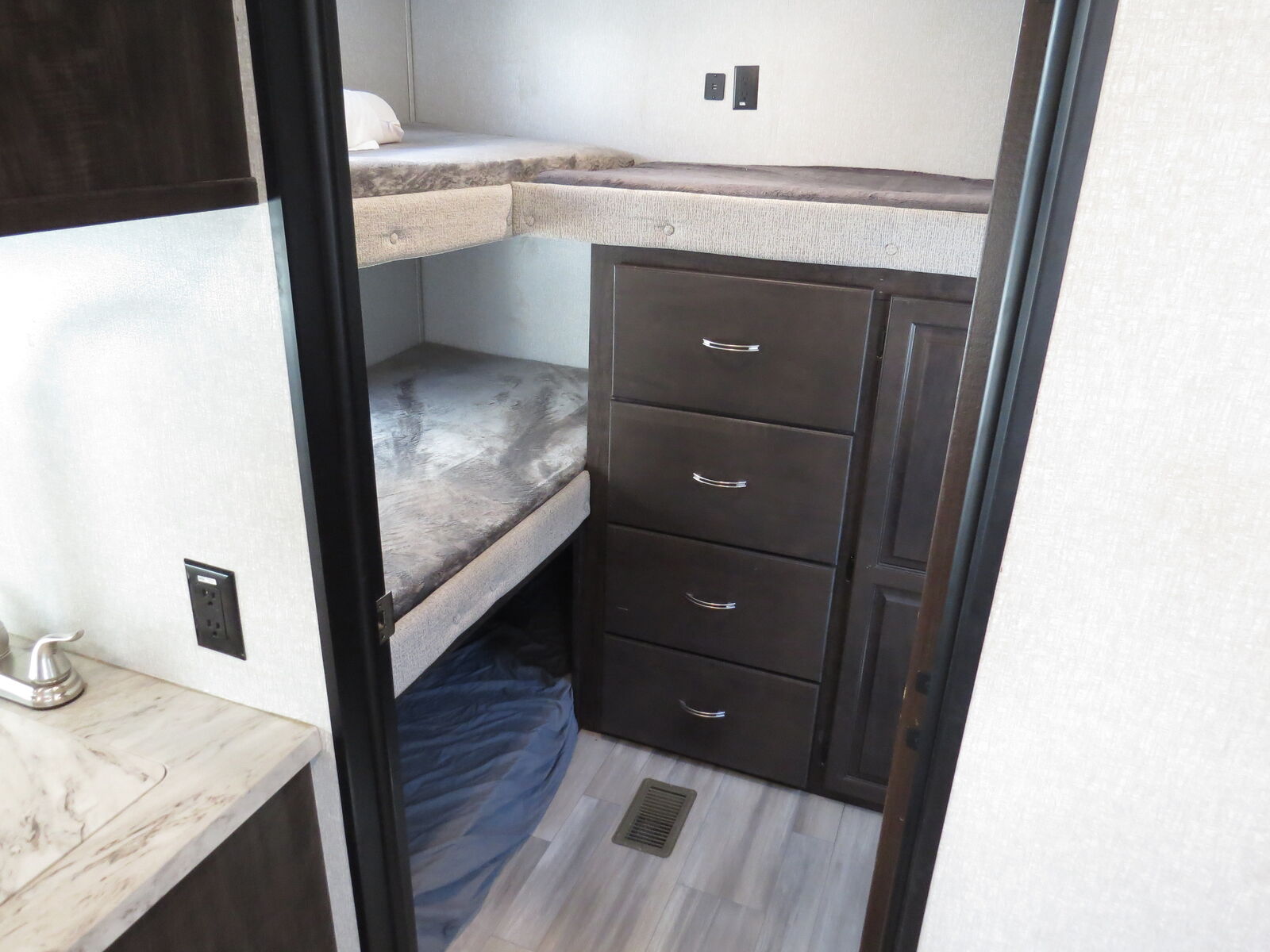 4 Bunks, 1 Slide out, BIG Bunk Room!, Underbelly Cover, Big U shaped Dinette Slide out, Front Queen walk around bed, Side Kitchen, Fireplace, Lots of counter space, Electric patio awning, Fiberglass Exterior, A/C unit and Heat.