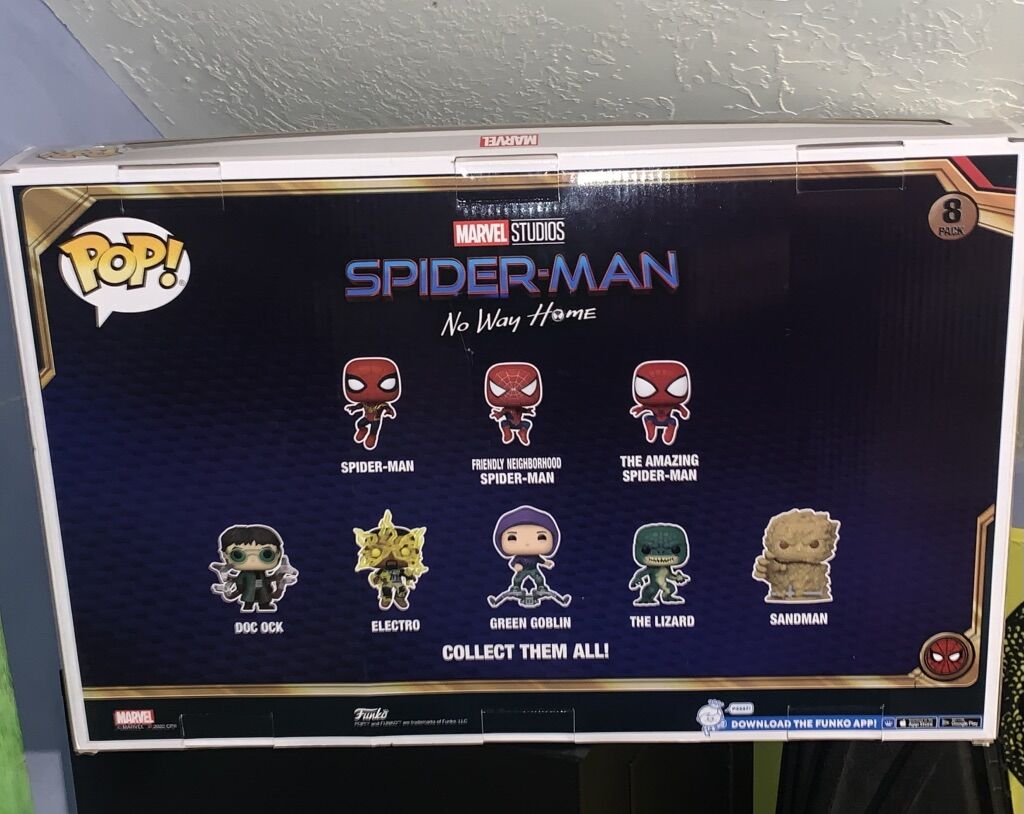 ApplePayMarvel Spider-Man No Way Home 8 pack Funko Pop Walmart Exclusive brand new in the box and box is in great condition. 8 pack includes 3 variations of Spider-Man, Doc Ock, Electro, Green Goblin, The Lizard and Sandman.