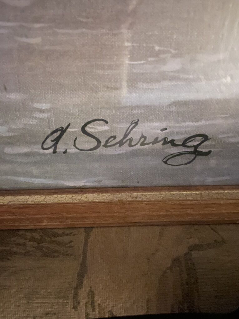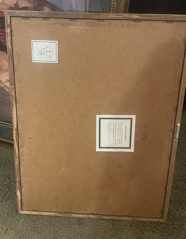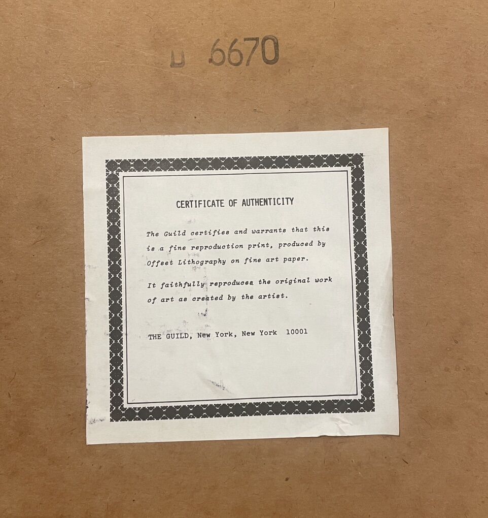 Rare Vintage Adolf Sehring Framed Art Print Little Girl on the beach in a 27.50” x 21.50” frame with COA. Lithography of a little girl on the beach by A Sehring, The frame measures 27.50” X 21.50” and has clear plastic in front of the Litho. On the back are two tags. One reads Certificate of authenticity. The Guild Certifies and warrants that this is a fine reproduction print, produced by offset Lithography on fine art paper as created by the artist. the Guild, New York, New York 1001. The second is a framemakers tag. Along with this is the stamped number D6670. Overall fair condition.
