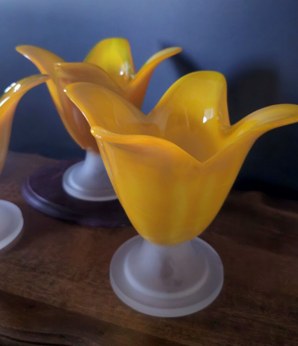 EXQUISITE shiny, pretty, yellow hand blown tulip trio with rounded soft, open, translucent pedal edges. Lightly frosted white bases with graduated finished edge. These 3 could be functional as a vase, a candle holder, candy dish, jewelry holder or bathroom decor.