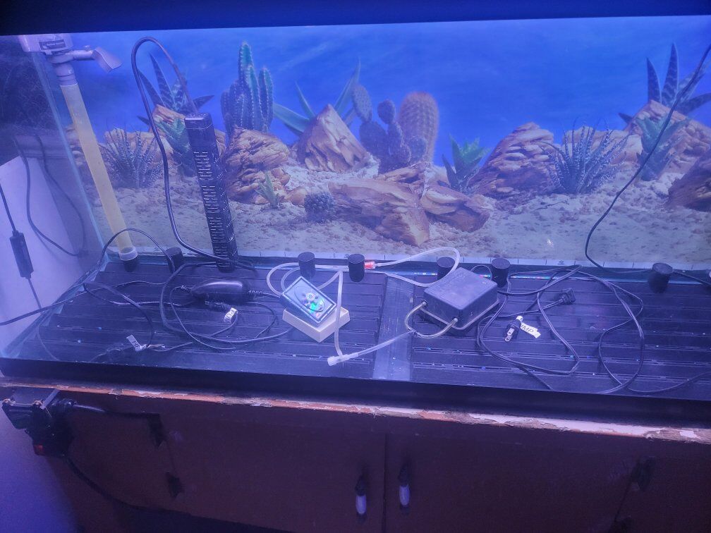 I am selling my 55 gallon and all accessories, I upgraded to a 125 gallon so I am selling the 55 gal. $240 for everything or $220 without the 2 switches Aquarium $50 2 glass lids $50 minus plastic cutouts Antique wooden stand $25 middle of shelf was cutout for a canister filter to fit under. 5 gallon bucket filled with multicolored gravel $15 Undergravel filter and 2 Powerheads $20 Air pump and one accessory $5 Heater $5 Hygger 42 watt 24/7 light with timer and adjustable brightness (7) colors $50 Red & Green power switches (attached to stand) optional $20 for both. the cactus background is removable (taped on)
