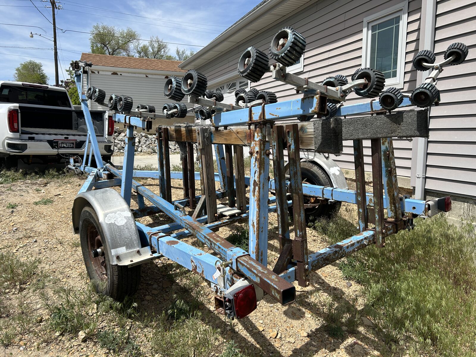 Venmo1981 EZ-Loader trailer that is solid and ready for use. Newer tires and bearing pack, brake system requires service, 2” ball, long trailer extension works great to avoid getting tow vehicle into the water, original documentation included, specifications of actual boat it hauled in documents. Fully adjustable to accommodate a variety of hull configurations. Wyoming clear title.