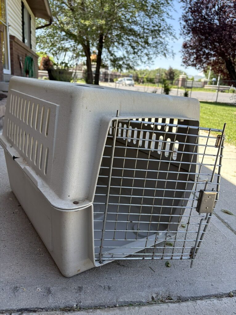 VenmoGood shape medium kennel. Probably fits a dog around 30 pounds or smaller. Been in my garage for a few years so it needs a good cleaning. But is still in good condition .