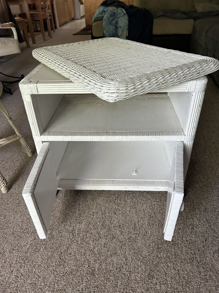 VenmoThis sturdy and clean wicker table has a unique swivel top that spins completely around - lazy Susan style. It also has a pass-through shelf, and two-door storage compartment. Lastly, it’s wheeled for easy transport and moving around. Measures 27” x 23” x 18.5”