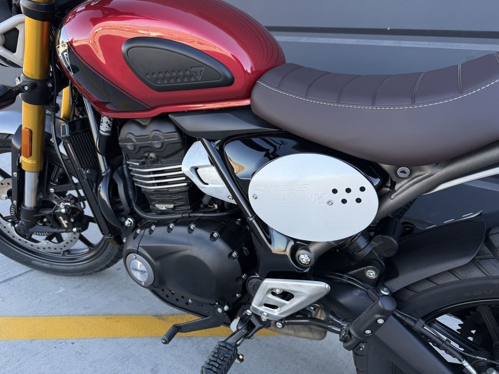 Trademark black powder-coated engine casings, tough gold anodized forks, high-quality paint, and exquisite logo detailing ensure the finish on the Scrambler 400 X is premium throughout.