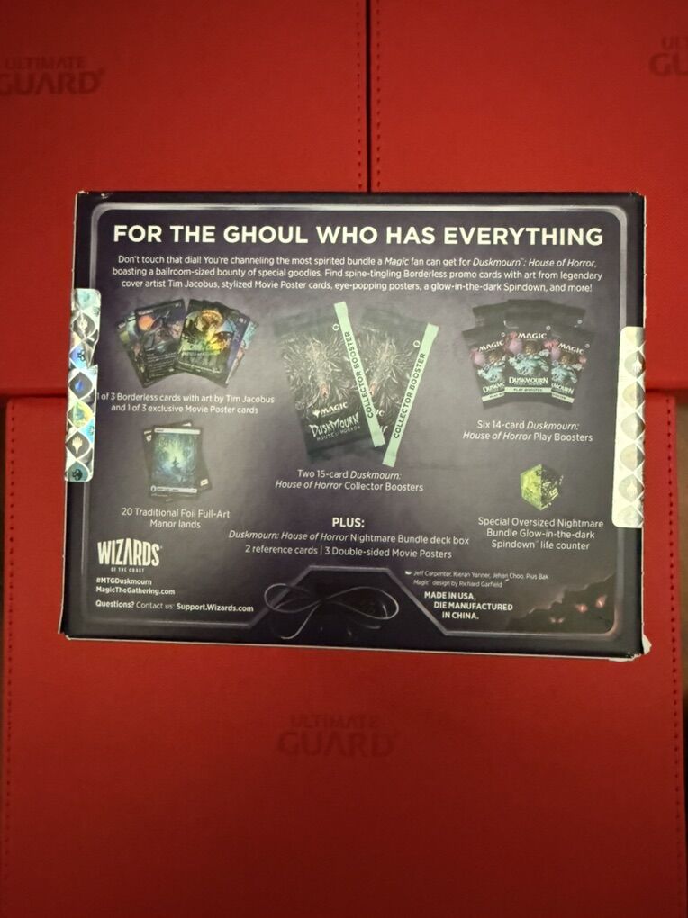 6 Duskmourn: House of Horror - Play Booster Packs 2 Duskmourn: House of Horror - Collector Booster Packs 20 foil Full Art Manor lands 1 Borderless promo card 1 Movie poster card 3 double-sided movie posters 1 Glow-in-the-dark Spindown life counter 1 card storage box 2 reference cards