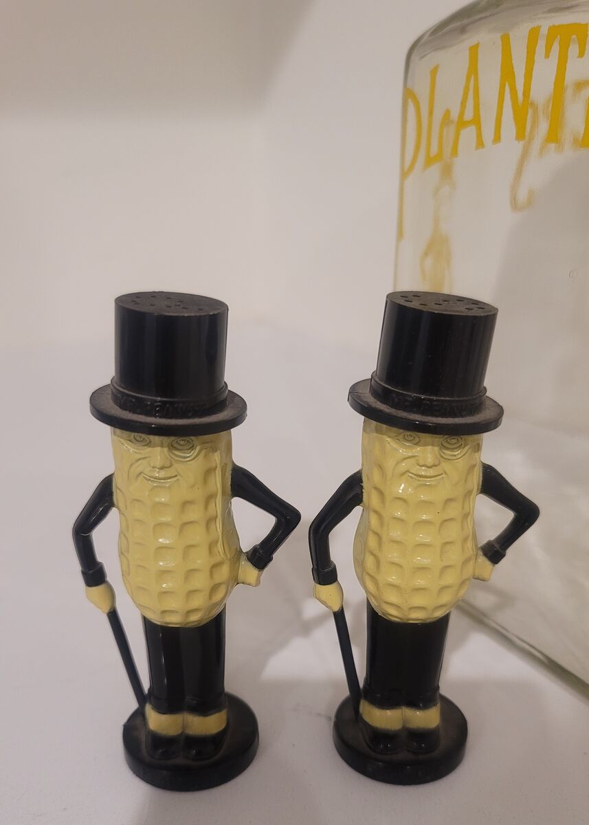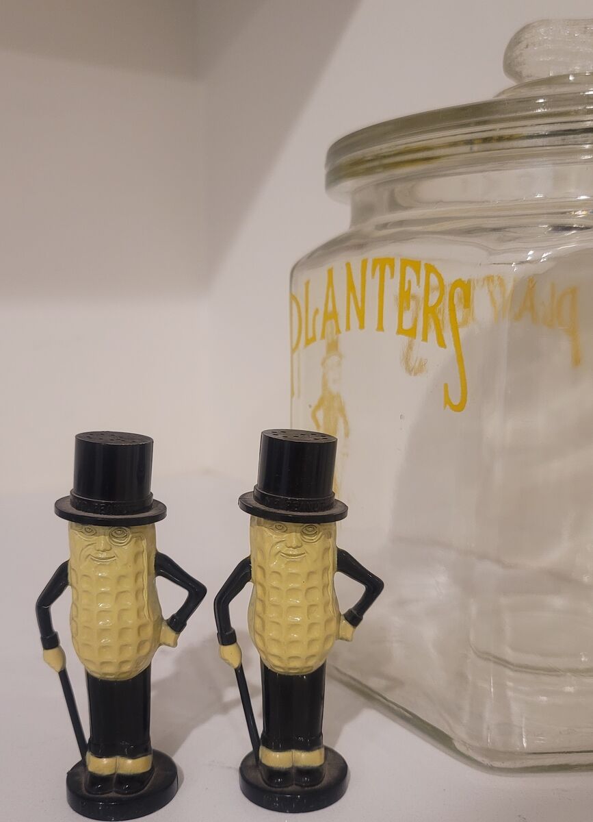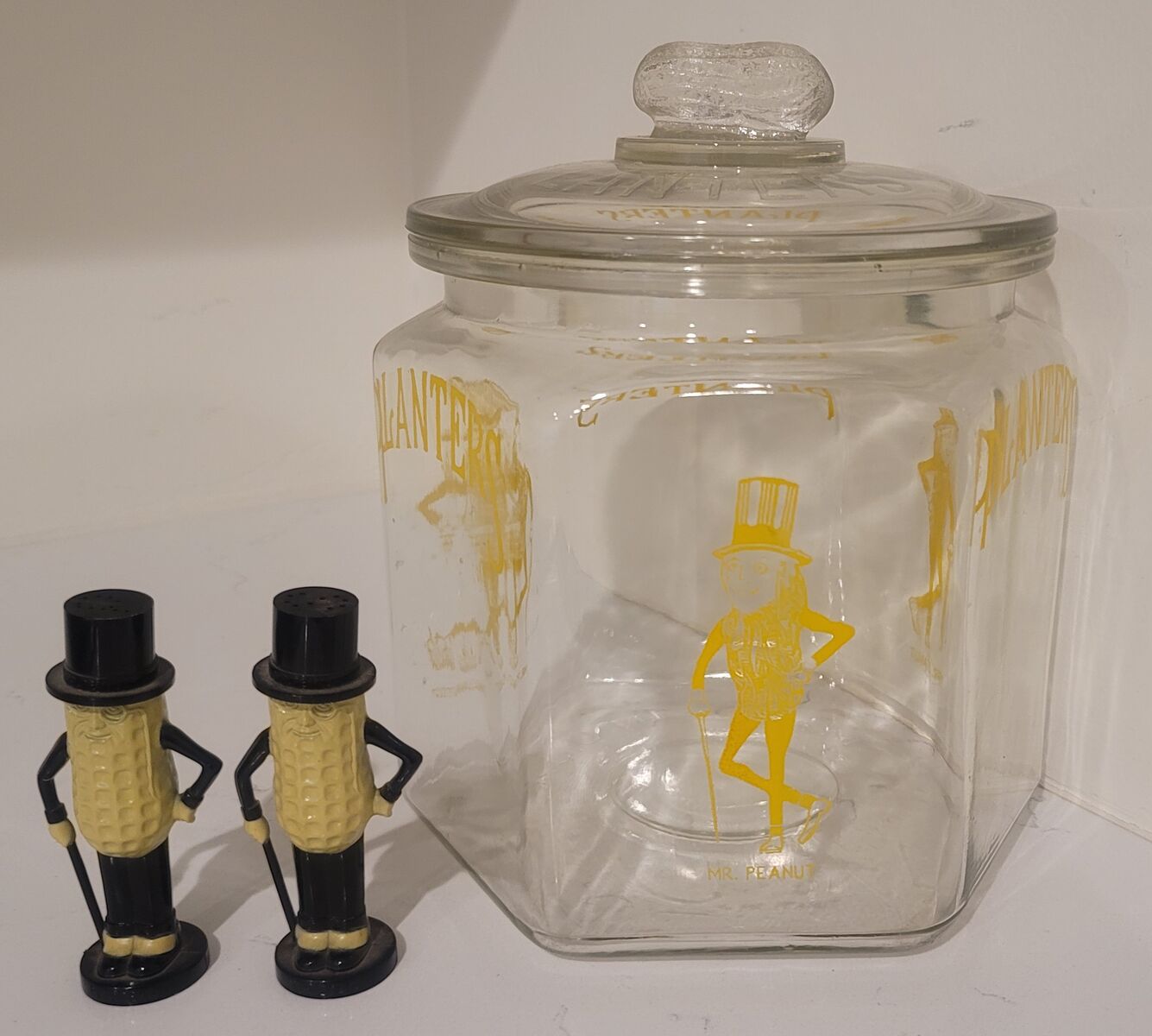 Vintage Mr. Peanut Planters counter Jar. Approximately 9" height. No chips or cracks. Also included are the Mr.Peanut salt and pepper shakers set.